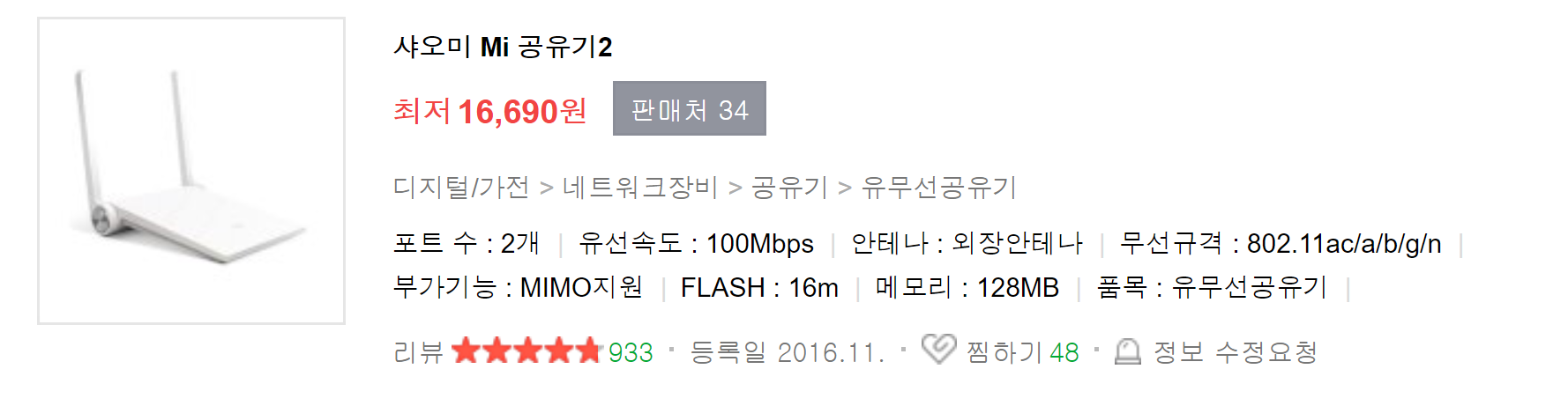 세상에 공유기는 많고 내가 살 공유기는 딱 한 개. 검색 조건은 안테나가 두 개 이상이었습니다. 그러다 눈에 띄는 제품 하나가 샤오미 라우터 시리즈였습니다. 샤오미의 경우 전용 어플리케이션을 제공하기도 하고, 제가 이미 샤오미 CCTV와 스탠드를 사용하고 있기 때문에 그 상성이 잘 맞다고 생각했어요. 그래서 샤오미 라우터를 더 찾아보던 중 USB 포트를 지원해서 간이 NAS처럼 쓸 수 있는 친구를 찾았어요. 그게 바로 샤오미 라우터 2였습니다.