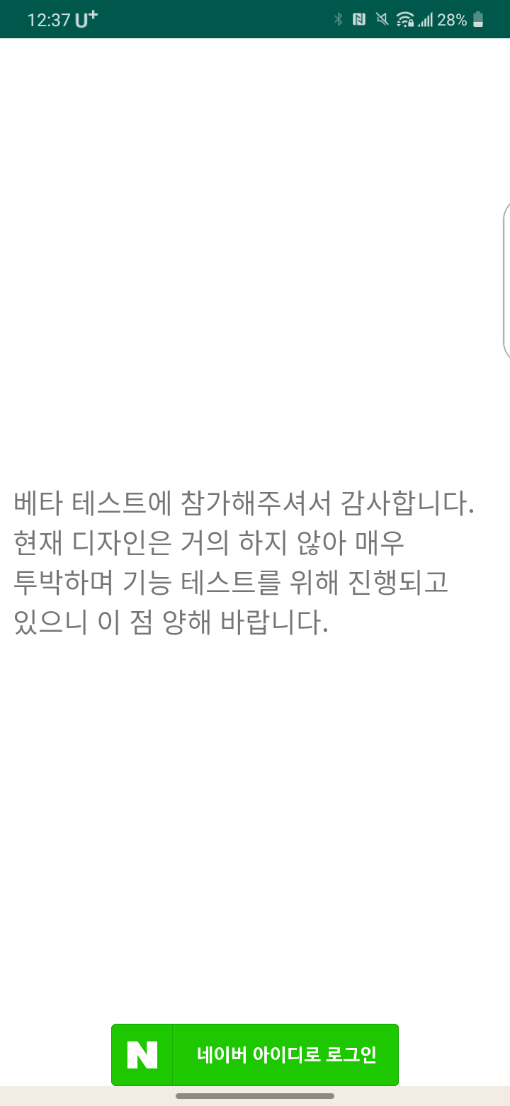 Play 스토어에 업로드된 버전이라면 그건 CBT 기간에 올렸다는 것이다. 현재와 정말 큰 차이가 있는데 여튼 네이버 아이디로 로그인 API에서 기본으로 제공하는 이미지를 다운받아 사용했다. 정말 로그인 기능뿐인 화면이다.