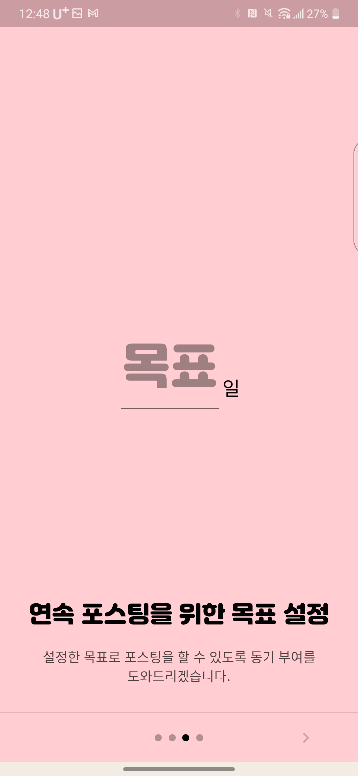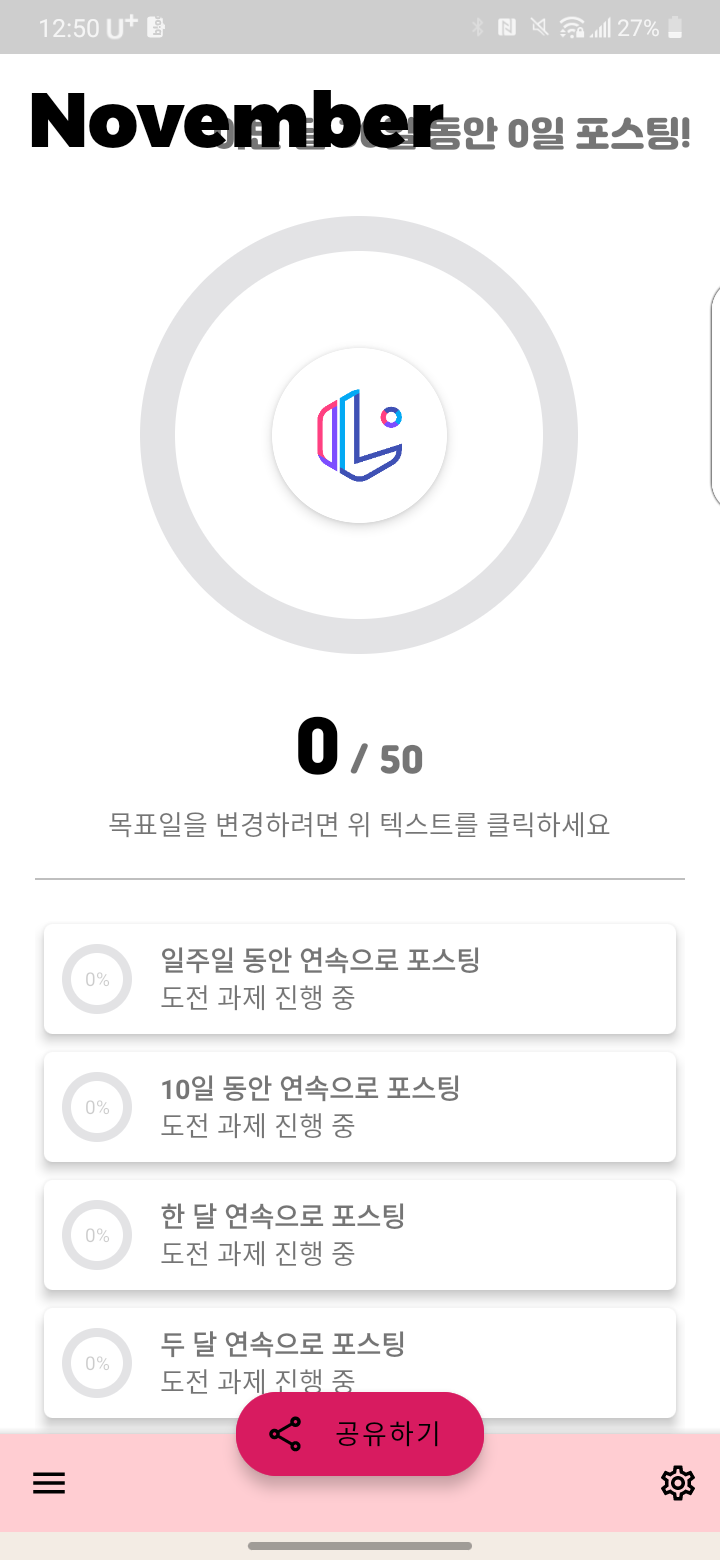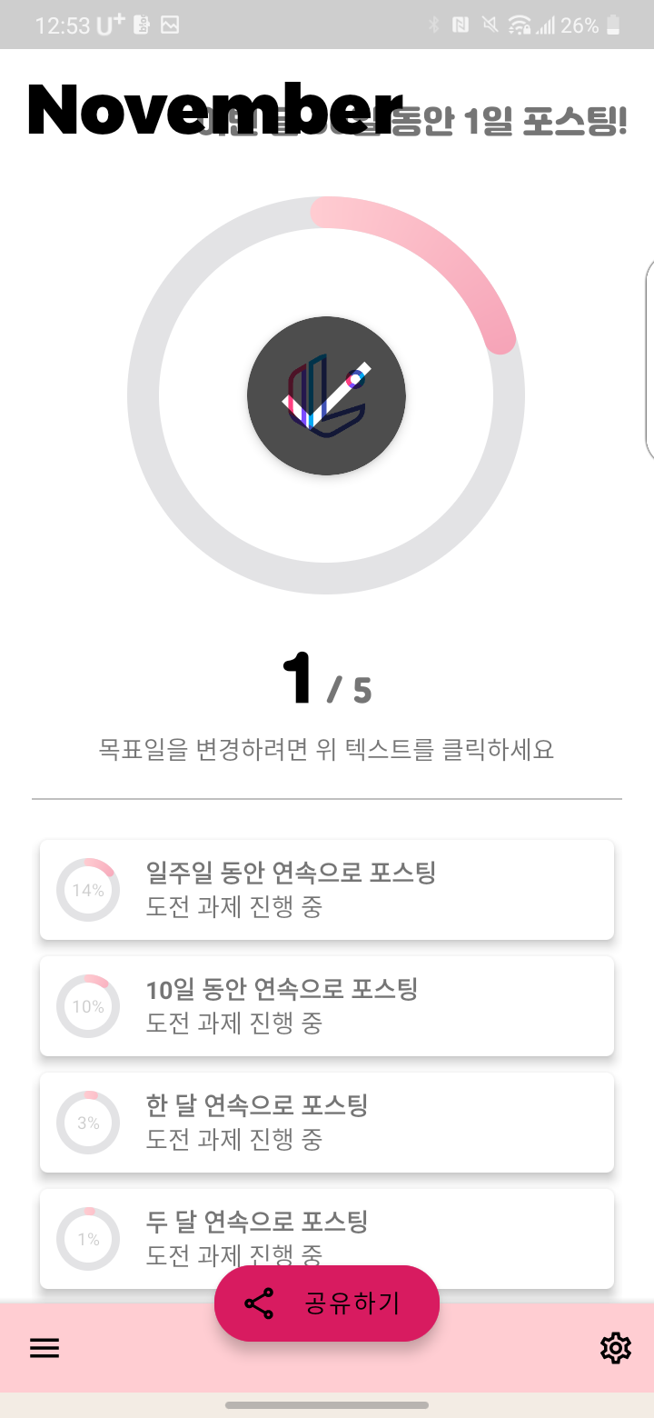 예전에도 프로필 사진을 그래프 한가운데에 박아두었는데, 저 때는 메인액티비티에 BottomNavigationView가 없어서 탭 형태가 아니기 때문에 프로필 사진을 누르면 프로필 액티비티가 뜬다. 그리고 목표일 변경 시 텍스트 클릭하면 바뀌게 처리해 두었었고, 가장 큰 차이점으로는 7일, 10일, 한 달, 두 달 연속 포스팅 등의 작은 목표 달성하는 UI를 했다. 나중에 생각했을 때 유저가 어차피 목표를 설정할 건데 저게 뭔 의미가 있나 싶어서 2.0 버전에는 빼버렸지만.