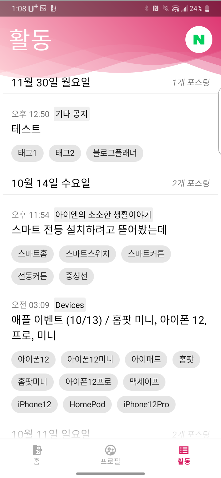새롭게 활동 탭이 생겼는데, 포스팅 정보를 불러오고 태그까지 불러오는데 태그를 누르면 검색 순위를 알 수 있게 해 두었다. 이 기능을 좋아하는 분이 꽤 많다.