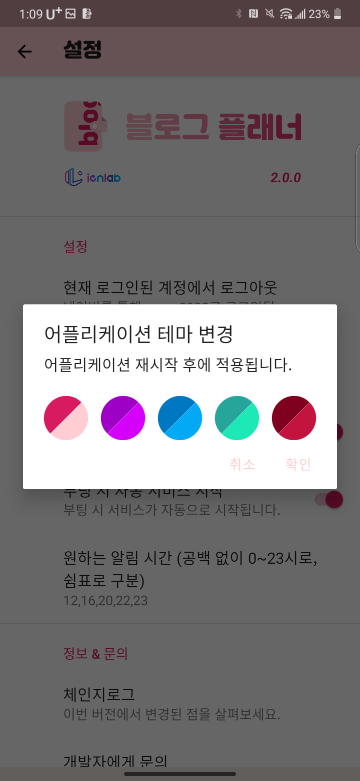 그 외에도 설정 디자인을 바꾸었다. 크게 바꾼 건 아니고 블로그 플래너 글자만 달랑 있는 것보다는 조금 더 꾸미고 싶어서 저렇게 해 두었다. 그리고 이웃 블로거 비비(vivi)님의 강력한 요구로 테마 기능을 넣었다. 색을 그냥 저렇게 4개를 더 추가했다.