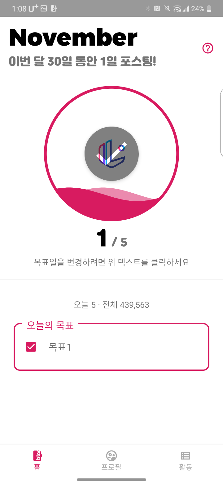 메인 화면이 확 바뀌었다. 먼저 3개의 탭으로 이루어져 있다. 홈 탭의 경우 전체적인 구성은 비슷한데 그래프가 물결 그래프로 바뀌었고 역동적인 느낌을 주고 있다. 그리고 방문자수를 확인할 수 있고 도전 과제는 모두 없어졌다. 대신 오늘의 목표를 확인할 수 있게 되었다.
