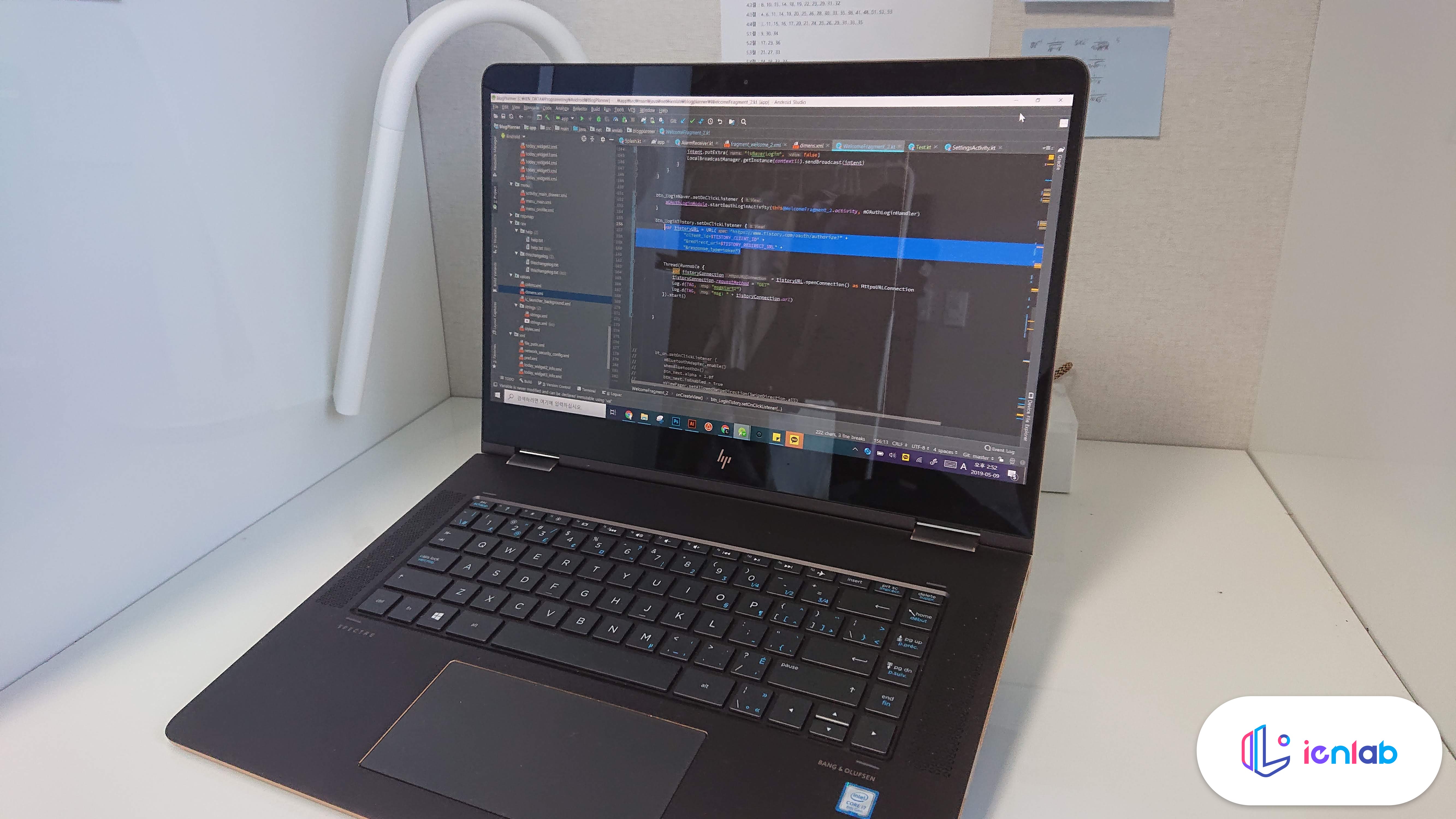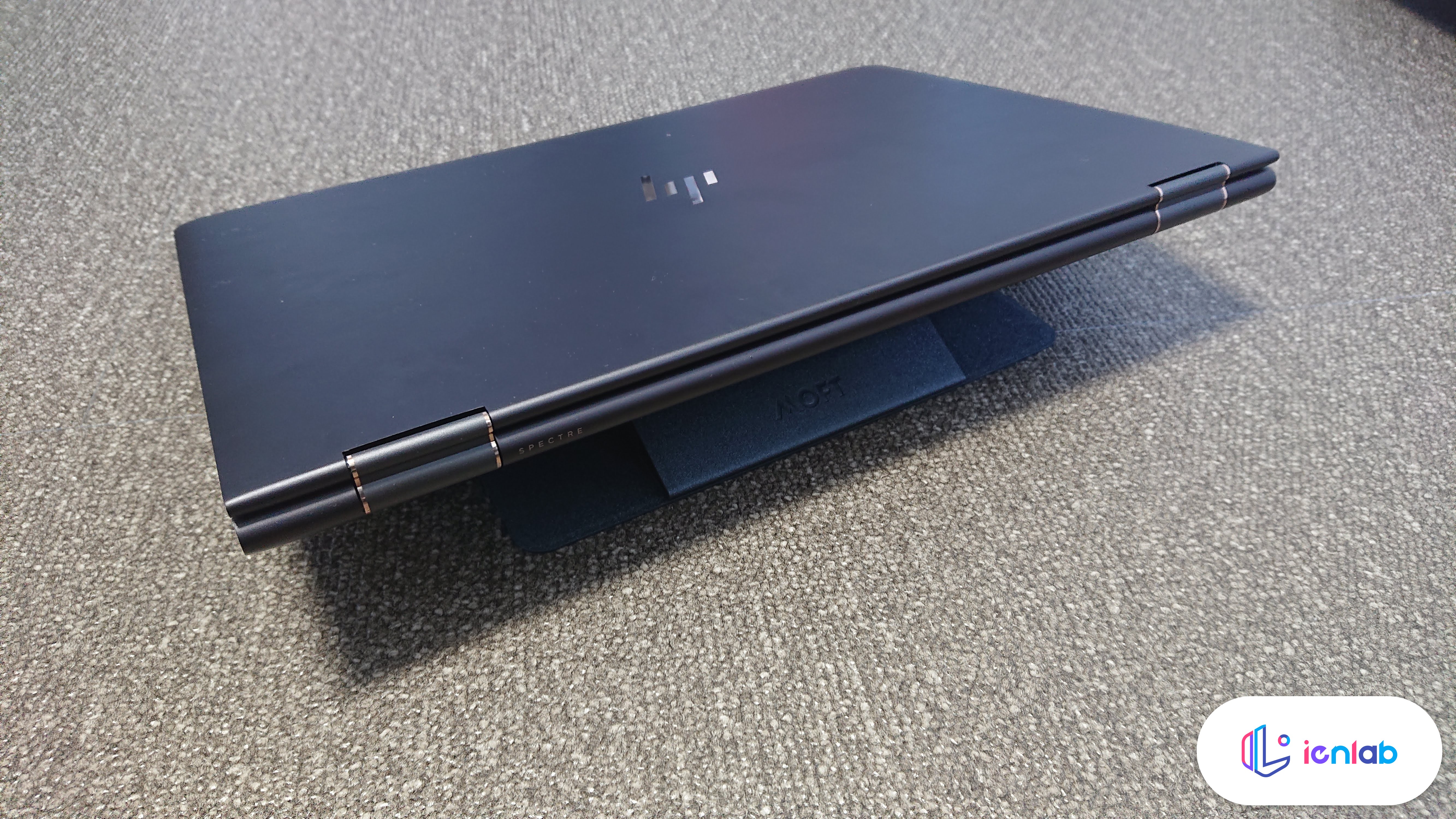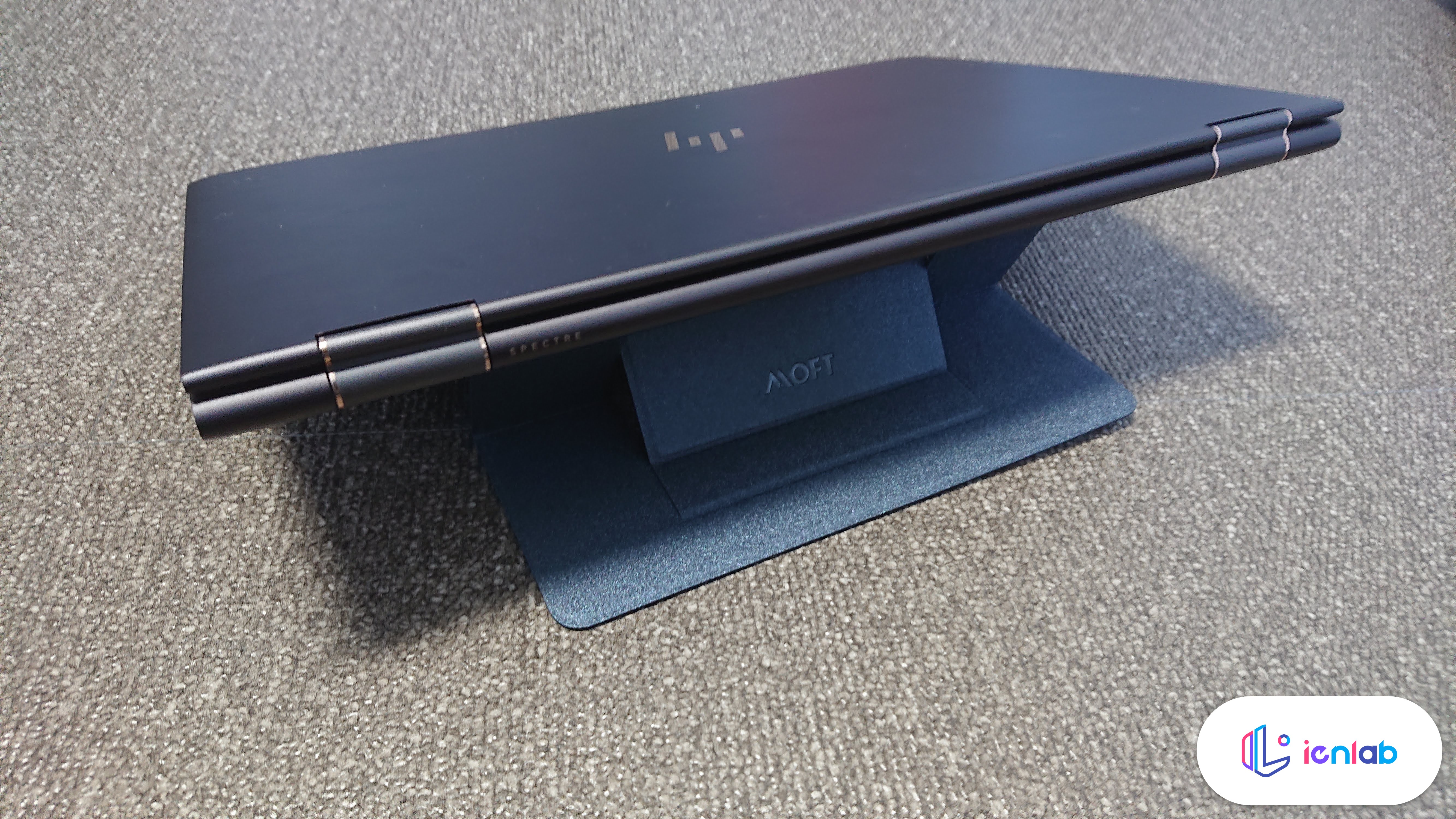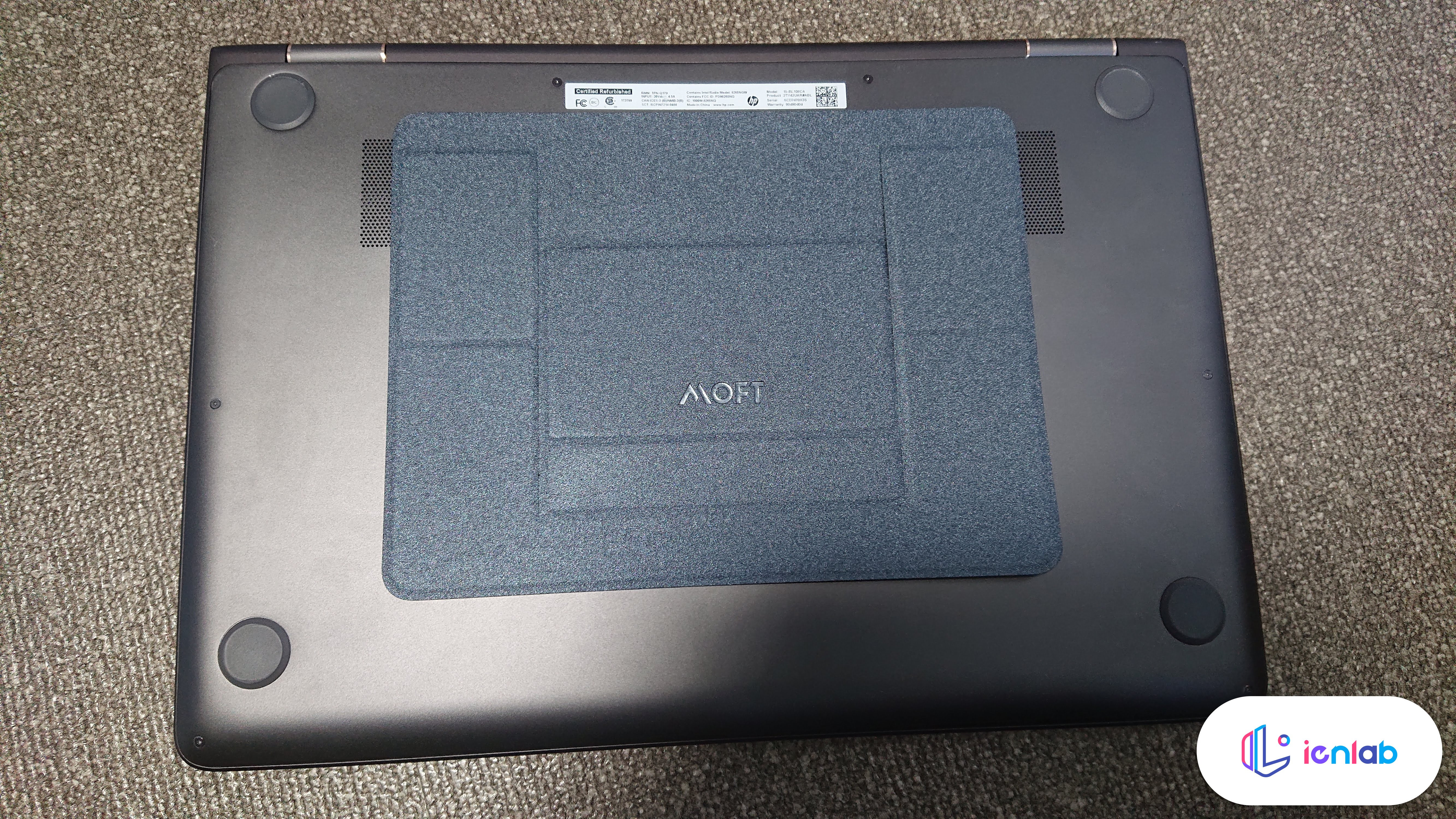 노트북은 HP Spectre x360 15"이고, 부착한 채로 15도와 25도 모드를 만들어 본 상태입니다. 생각보다 훨씬 더 단단하고 고정이 잘 됩니다. 25도 모드에서 저 로고가 있는 곳을 꺾어서 고정하면 15도가 됩니다.
