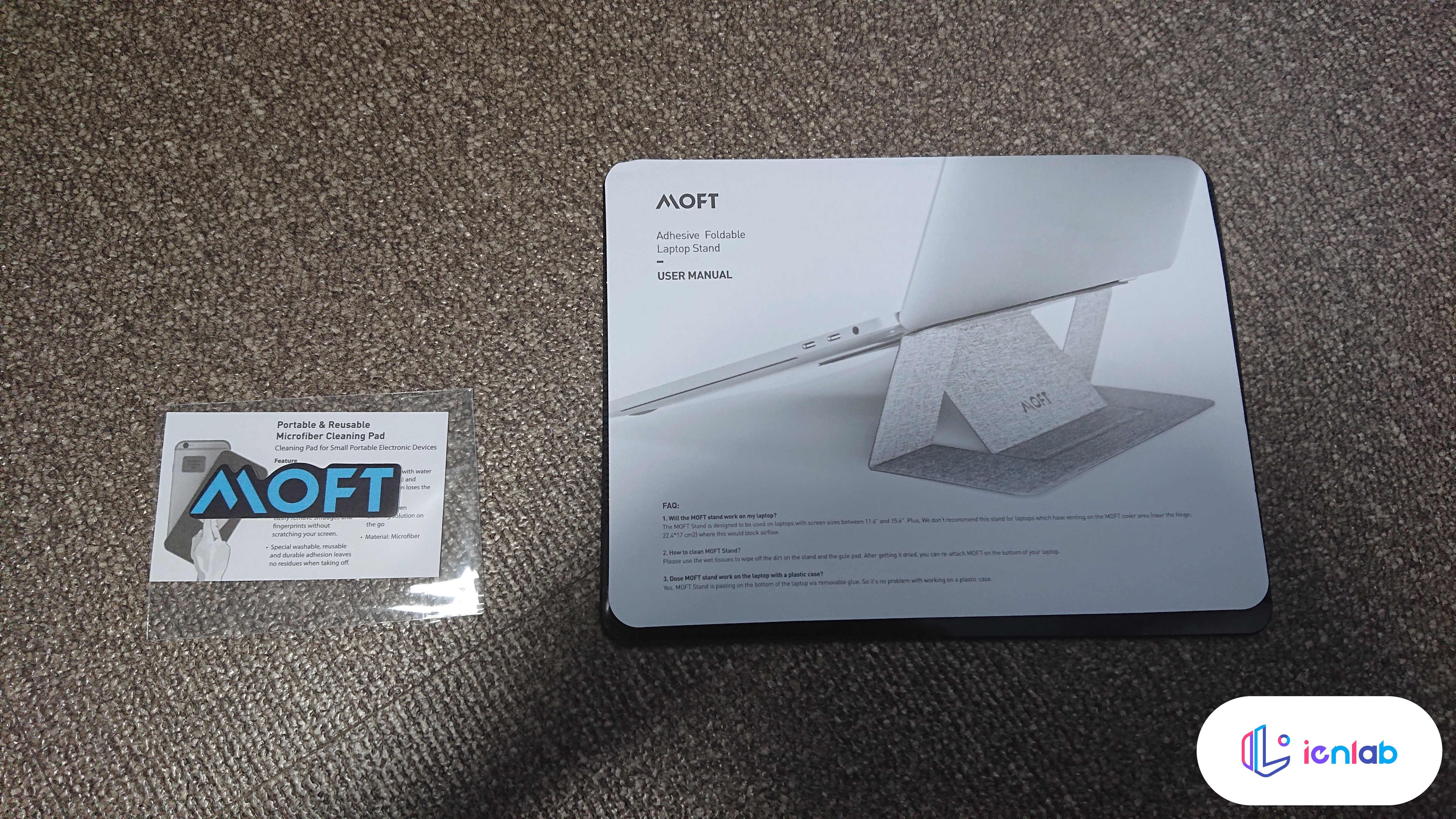 본의아니게 제 그림자가 제품을 가리지만, 어쨌든 제 노트북이 검은색 쪽이기 때문에 노트북에 부착할 건 스페이스 그레이 컬러입니다. 종이 포장으로 되어 있는데, 환경을 생각해서 비닐 대신 종이 포장으로 포장을 한 걸까요? 하여튼 그건 그렇다고 치고, 내부에는 극세사 청소 패드와 사용자 메뉴얼, 그리고 제가 주문한 MOFT (모프트) 노트북 스탠드가 저렇게 납작하게 있습니다. 생긴 것만 보면 그냥 마우스 패드 느낌이에요.