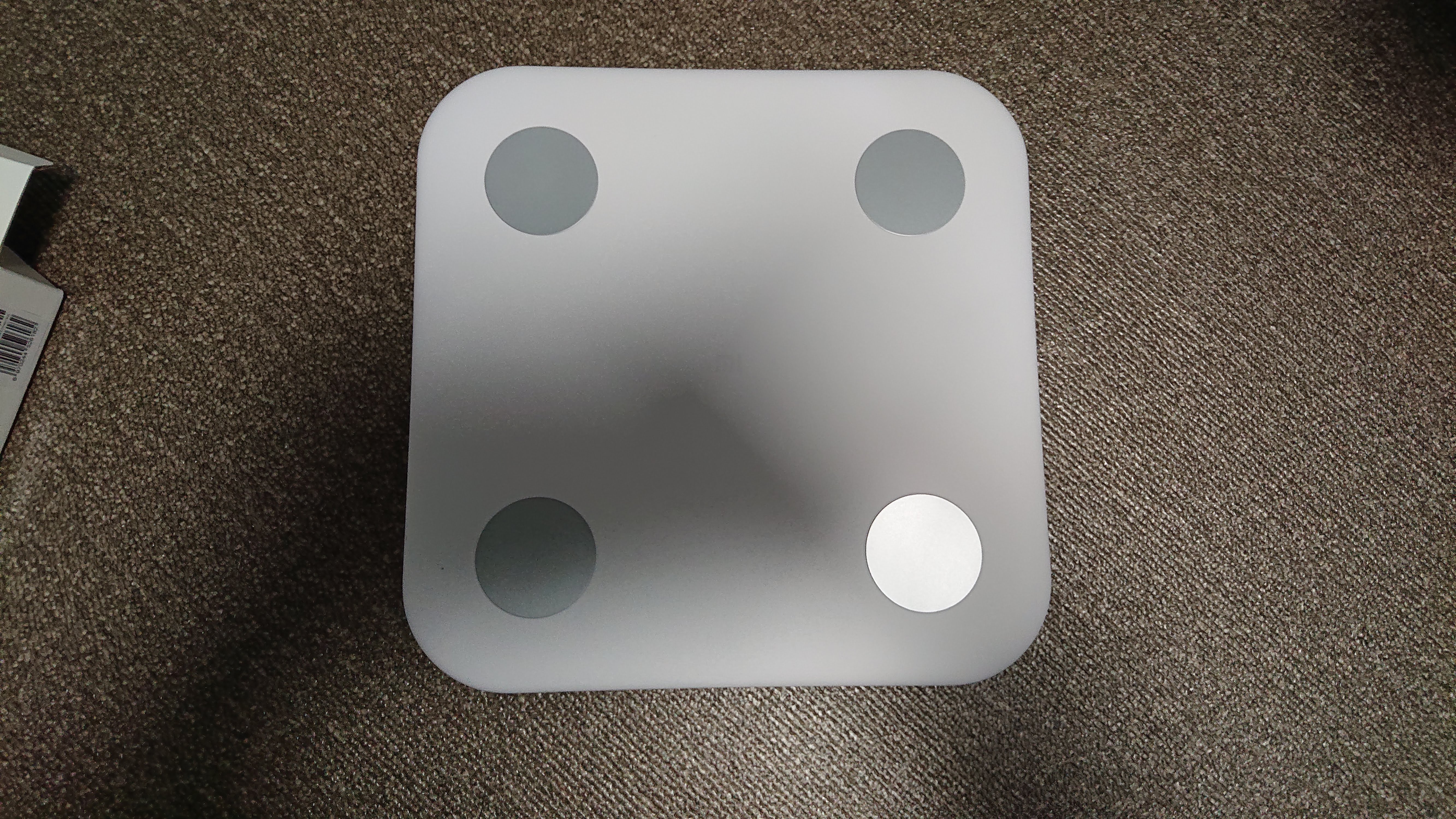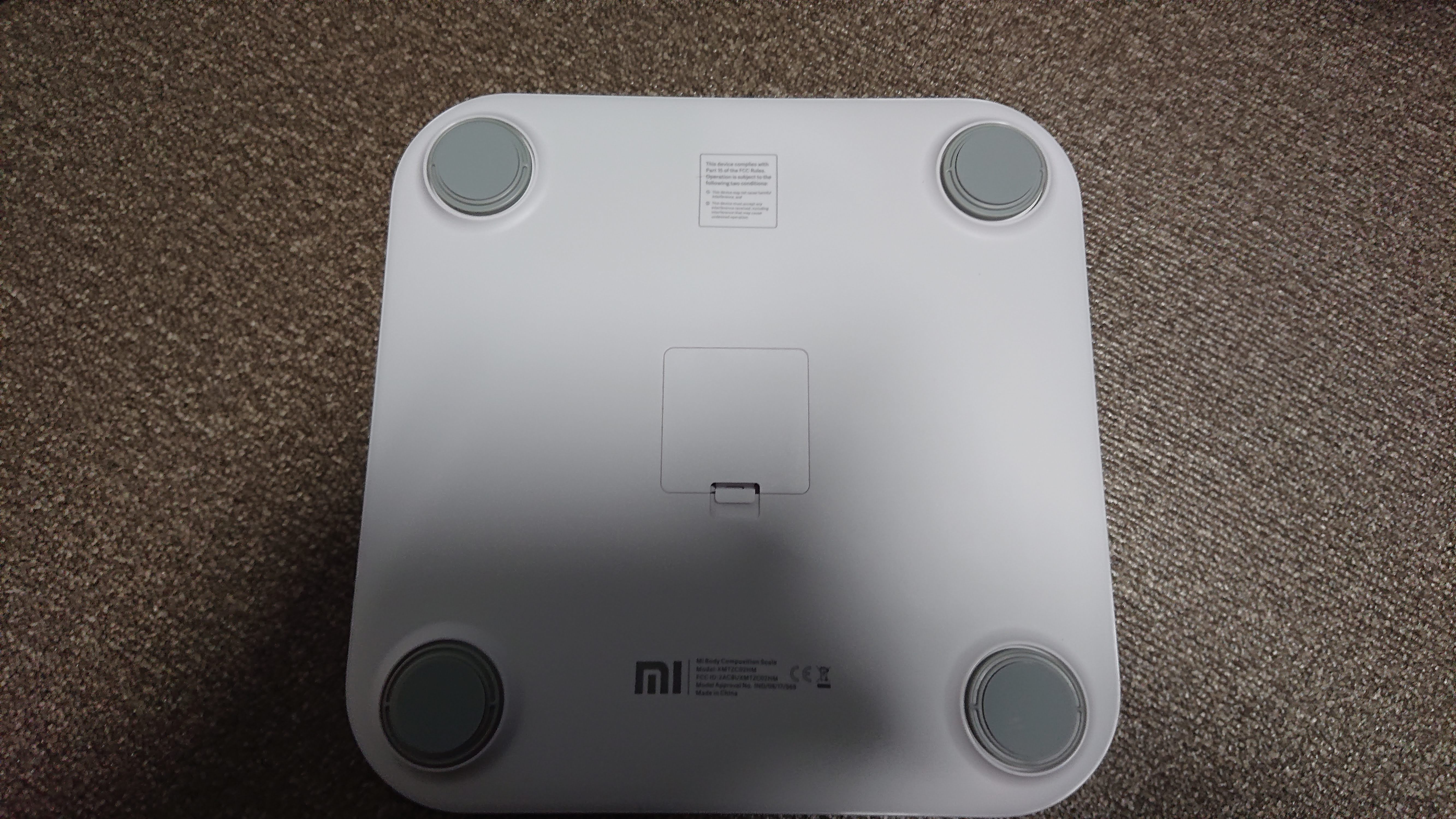후면? 바닥면입니다. 미 스케일 2를 지탱해주는 4개의 고무패킹, 그리고 AAA 건전지를 끼울 수 있는 곳이 있네요. 샤오미 로고와 인증 마크 등이 그려져 있습니다. 그러면 실제로 사용할 때는 어떻게 표시가 날까요?