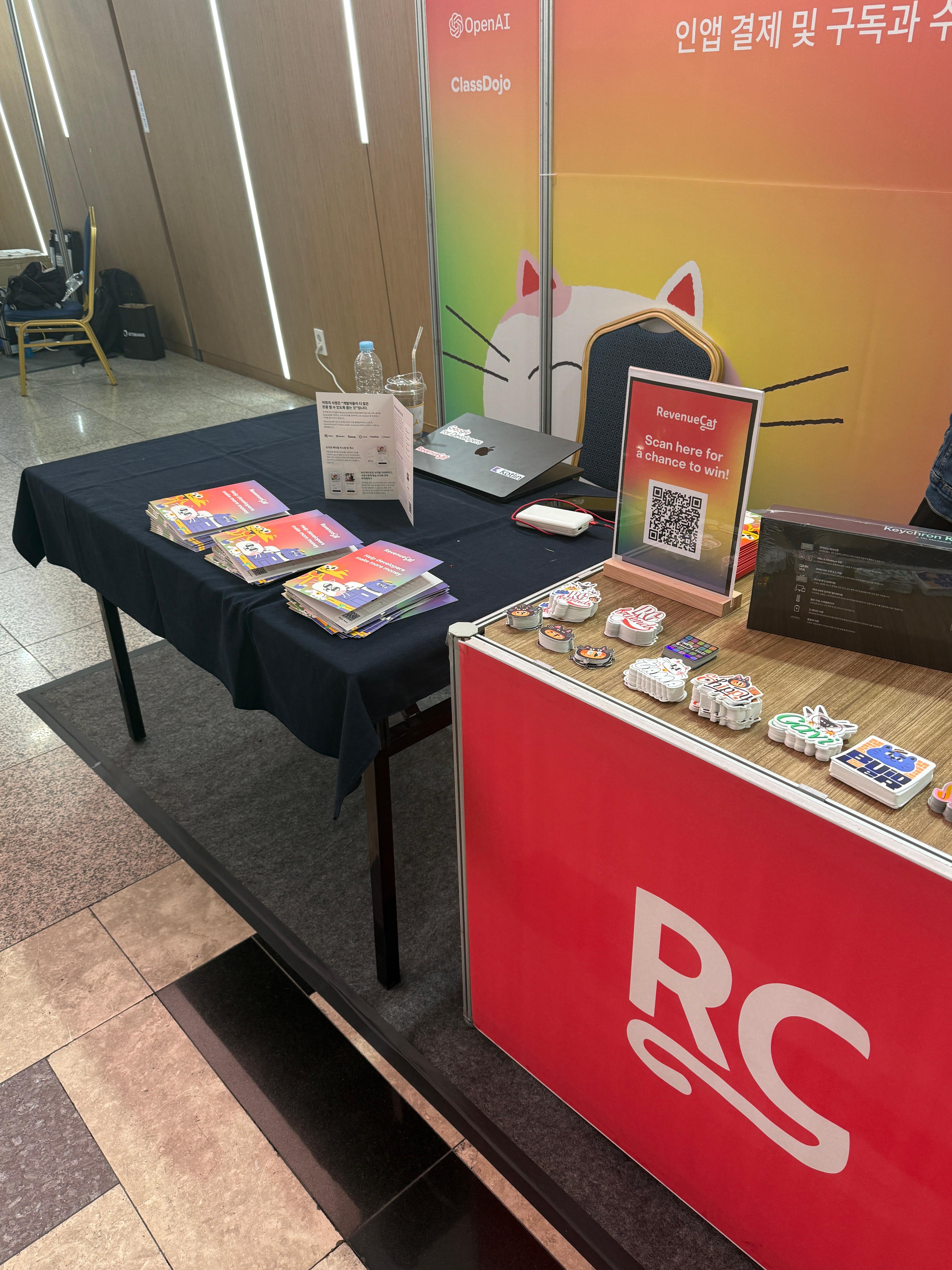 skydoves님이 부스를 운영하고 계셨다. 카톡과 GitHub에서만 보던 분이 여기 계시니 좀 신기하기도 했고.. RevenueCat의 초대권을 받았기에 한 번 더 부스를 찾아가서 직접 RevenueCat의 장점에 대해 묻고 그 답을 얻을 수 있었다. 다만 QR코드를 통해 설문조사를 했을 때, RevenueCat을 사용한 적이 없다고 하니 시시하게 설문이 종료돼서 부스의 운영 목적은 조금 아리송하달까.