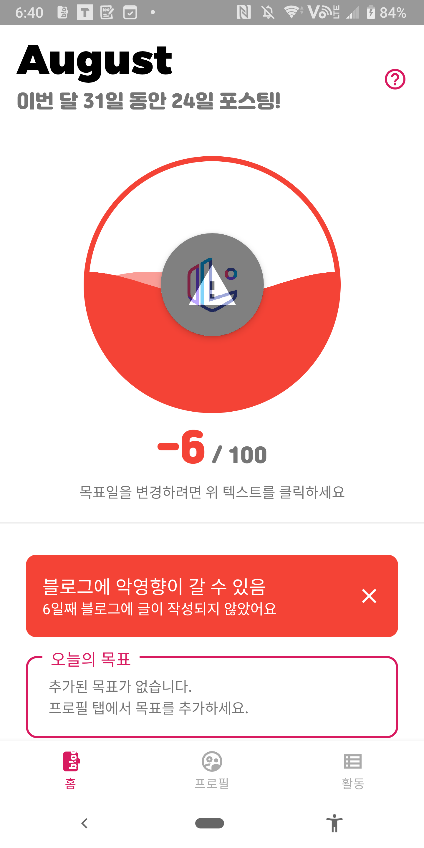 - 연속 미포스팅 시, 그래프가 빨개지고 마이너스로 얼마나 하지 않았는지 숫자로 보여줍니다.