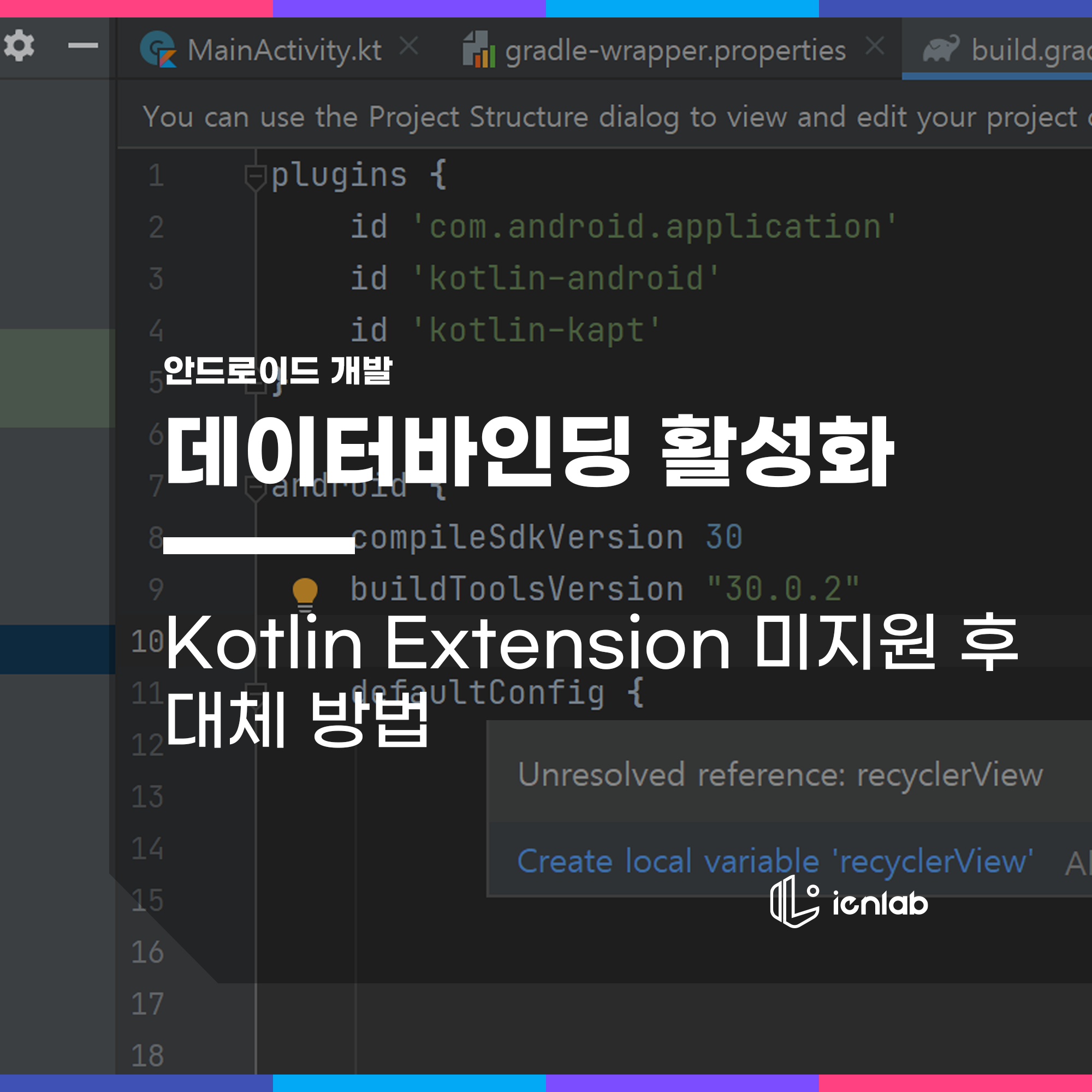 그렇기 때문에 코틀린 익스텐션을 제외한 방법으로 레이아웃의 뷰를 가져와야 하고, 그 방법 중 하나인 데이터바인딩을 이용해 이 문제를 해결할 것입니다.