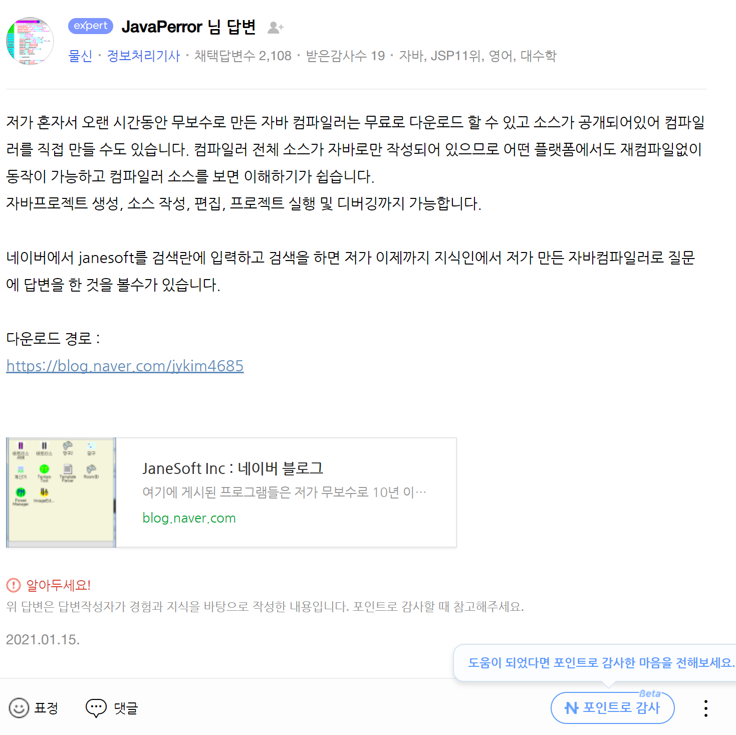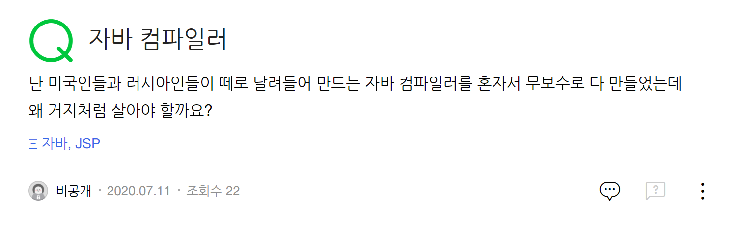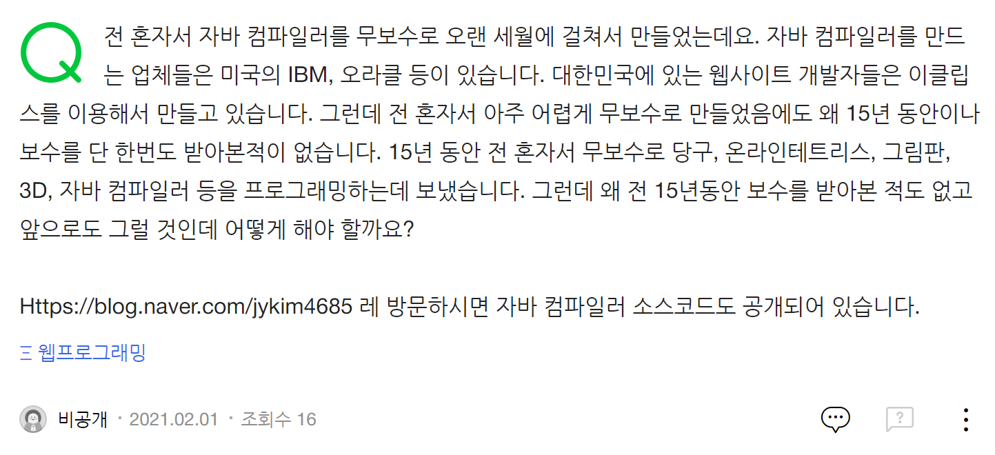 요즘 지식IN 활동을 하고 있는데, 카테고리에 맨날 꾸준하게 뜨는 사람이 있다. 뭔가 하니, 자기가 자바 컴파일러를 혼자서 무보수로 다 만들었는데도 빚에 허덕인다가 주 레파토리. 이걸 왜 계속 질문에 하는거야. 예전에 페북 모 코딩 그룹에서 보았던 모 키보드 개발자가 생각나는 꾸준글이다. 답변을 많이 달아서 지식IN 등급이 높은데 하나같이 다 자기 컴파일러랑 블로그 홍보중이고, 블로그 들어가보면 뭐 얼마 송금해라 이런 게 적혀져 있더라.