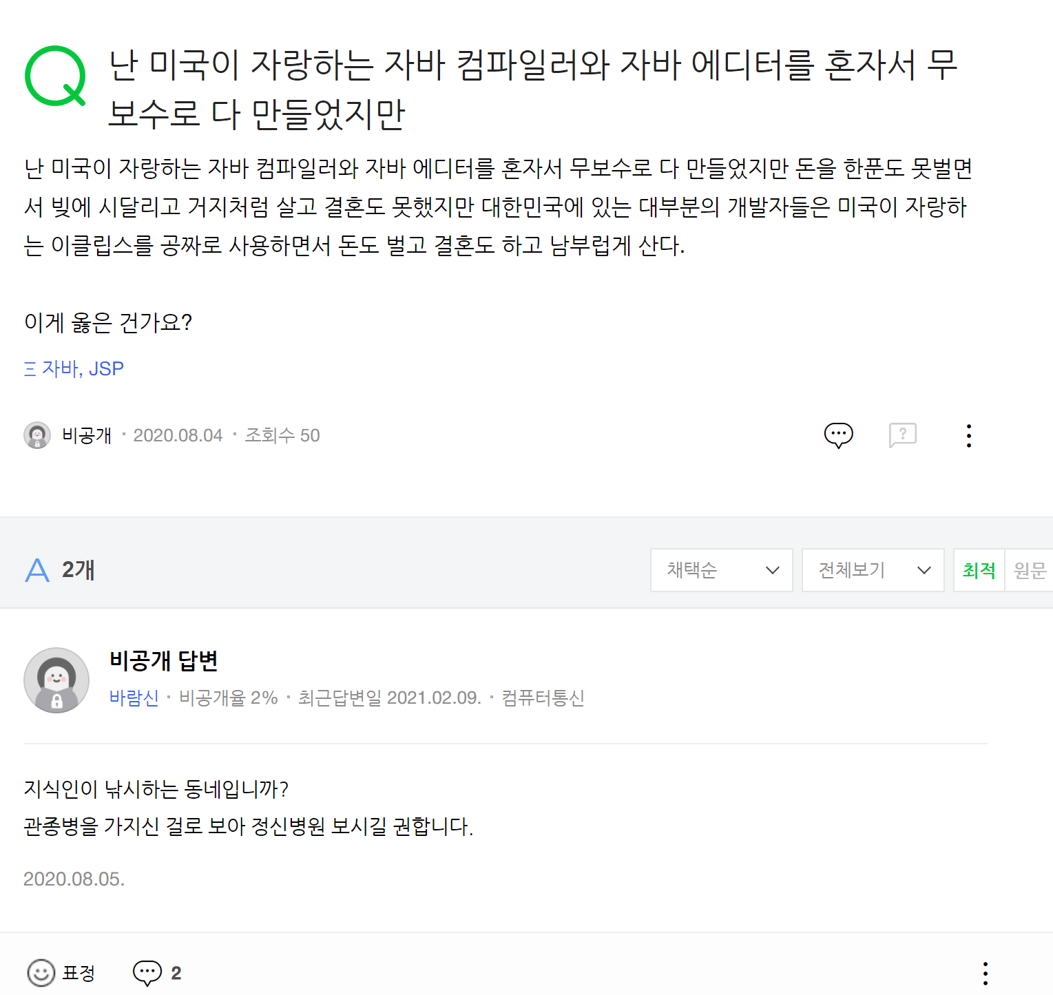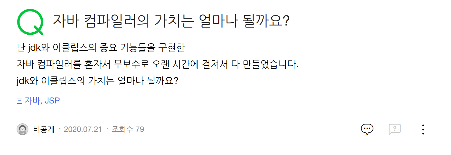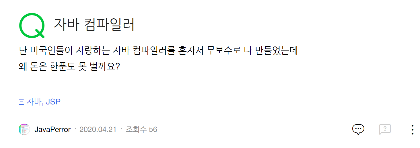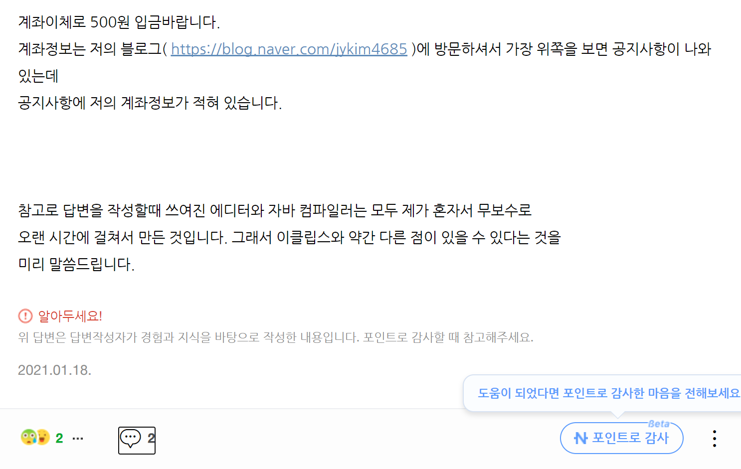 요즘 지식IN 활동을 하고 있는데, 카테고리에 맨날 꾸준하게 뜨는 사람이 있다. 뭔가 하니, 자기가 자바 컴파일러를 혼자서 무보수로 다 만들었는데도 빚에 허덕인다가 주 레파토리. 이걸 왜 계속 질문에 하는거야. 예전에 페북 모 코딩 그룹에서 보았던 모 키보드 개발자가 생각나는 꾸준글이다. 답변을 많이 달아서 지식IN 등급이 높은데 하나같이 다 자기 컴파일러랑 블로그 홍보중이고, 블로그 들어가보면 뭐 얼마 송금해라 이런 게 적혀져 있더라.