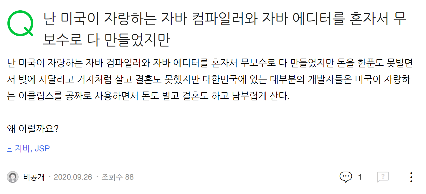 난 미국이 자랑하는 자바 컴파일러와 자바 에디터를 혼자서 무보수로 다 만들었지만 돈을 한푼도 못벌면서 빚에 시달리고 거지처럼 살고 결혼도 못했지만 대한민국에 있는 대부분의 개발자들..