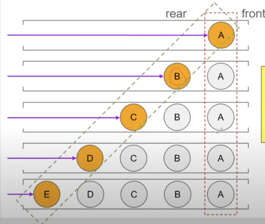 k번째 원소 제거 : k-1번째까지는 팝, 푸시 해서 뒤로 뺀다. 팝한 걸 다시 푸시. (앞에 있던 게 뒤로 간다.) 시간 복잡도 O(N*K)