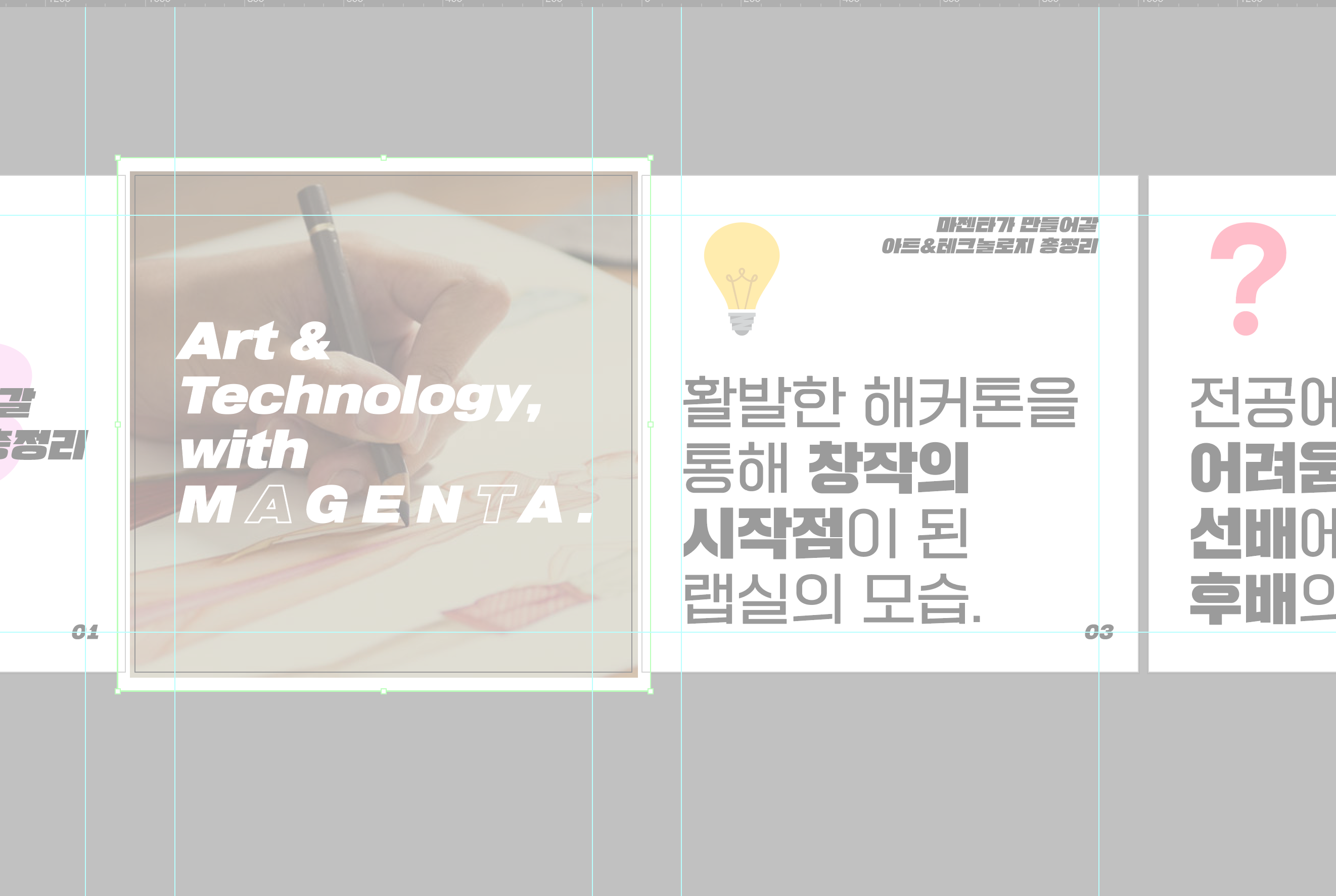 이걸로 9개짜리 카드뉴스 끝이다. 내가 자초한, 나에게 과중된 작업. 이번 학생회 모든 브랜드 아이덴티티 카드뉴스를 맡았다. 눈 아프다. 이렇게 무리하면 안 되는데.