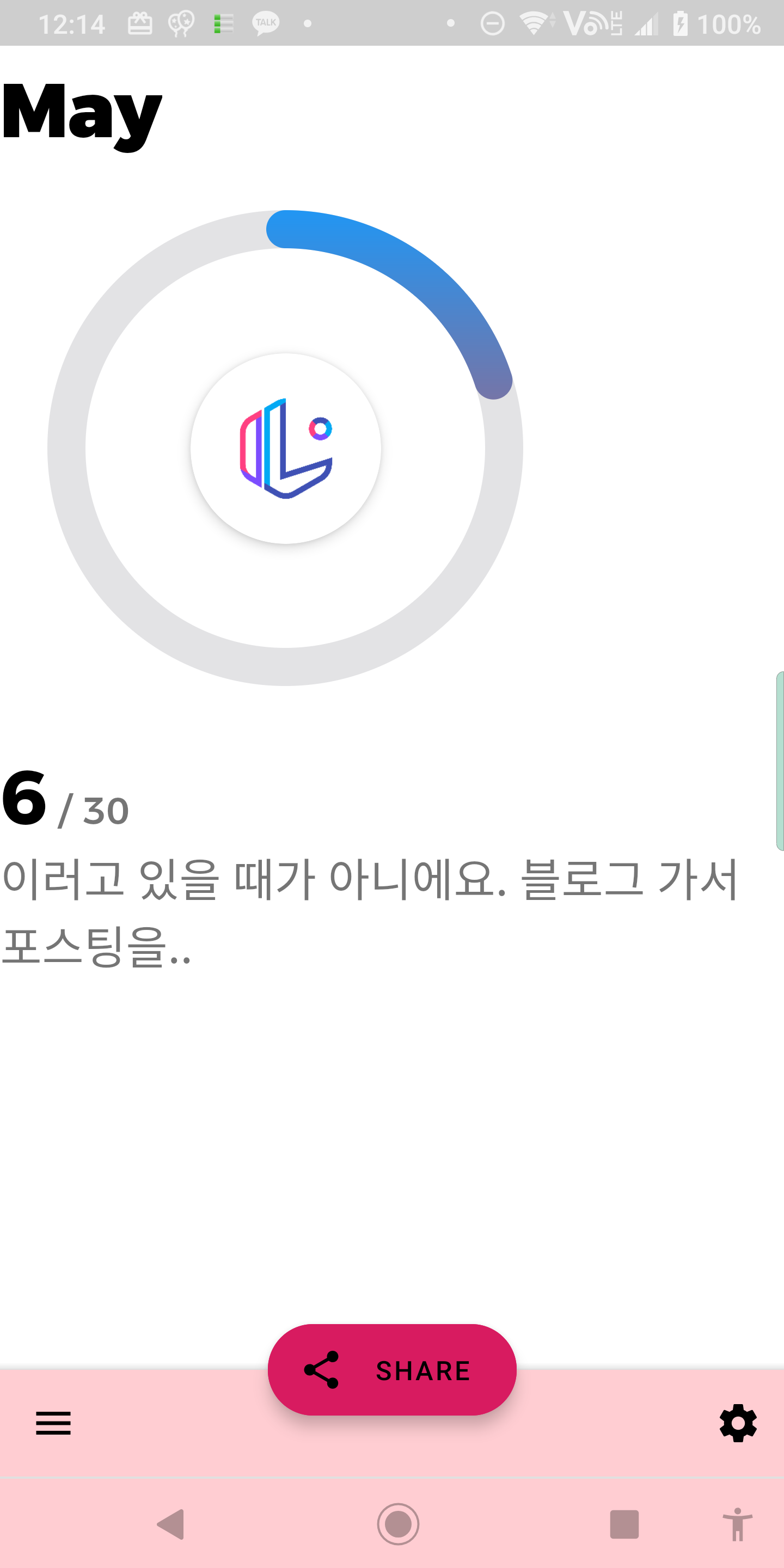 처음과 비교하면 정말 많이 바뀌었다. 결국 목표일 대비 현재의 연속 포스팅 날짜를 그래프에 표시해주는 걸로 하기로 했다. 저기에는 딱 로딩됐을 때 그래프가 이렇게 돌아가면서 자연스럽게 로드되는 거 구현하는 것도 재밌기도 했지만 시간이 좀 걸렸다. WelcomeActivity가 첫 사진인데, 새롭게 목표 설정 탭을 추가했다. 이렇게 하고 나중에 변경하려고 설정에 이걸 추가했더니 계속 튕겨서, 어쩔 수 없이 대안으로 MainActivity에서 수정하는 걸로 정했다. 처음에는 프로필 사진을 꾹 누르면 날짜를 바꾸는 걸로 했다 (영상도 그렇게 찍힘). 근데 별로 직관적이지 않은 것 같아서 저 숫자 (6/30)을 누르면 바꿀 수 있는 걸로 조금 전에 변경했다.