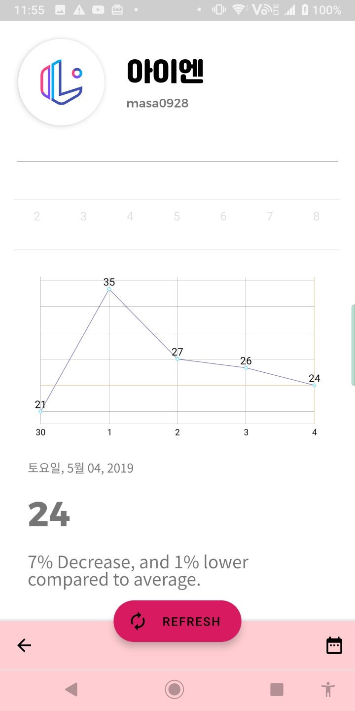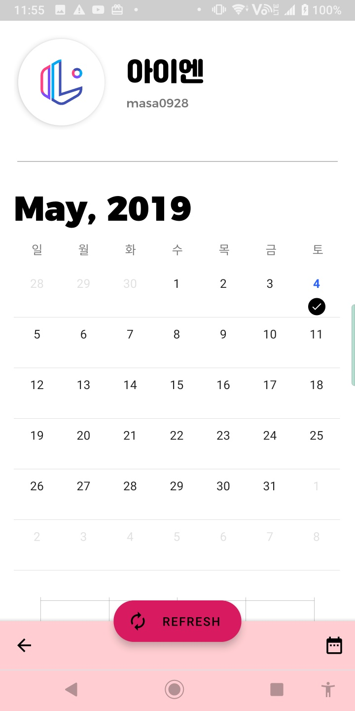 점점 앱이 완전해져 간다. 건드리지 않았었던 개인 프로필 창도 디자인을 수정했다. 프로필 사진은 메인 화면처럼 입체 원형 카드처럼 했고, 닉네임과 아이디를 배치했다. 아래에는 처음에 메인 화면에 표시하려고 했던 달력과 투데이 그래프를 넣었다. 아직 언어를 제대로 해놓지 않아서 한글이랑 영어랑 섞여 있는데 이건 나중에 수정하면 된다. 그래프가 조금 더 이쁘면 좋을 텐데, 그건 나중에 생각하기로 하고. 그리고 이제 햄버거 메뉴 (Drawer)도 넣었다. 이제 투데이@블로그에 있는 위젯을 넣으면 작업은 거의 끝이다. 로고 디자인을 꾸며야 하는데.