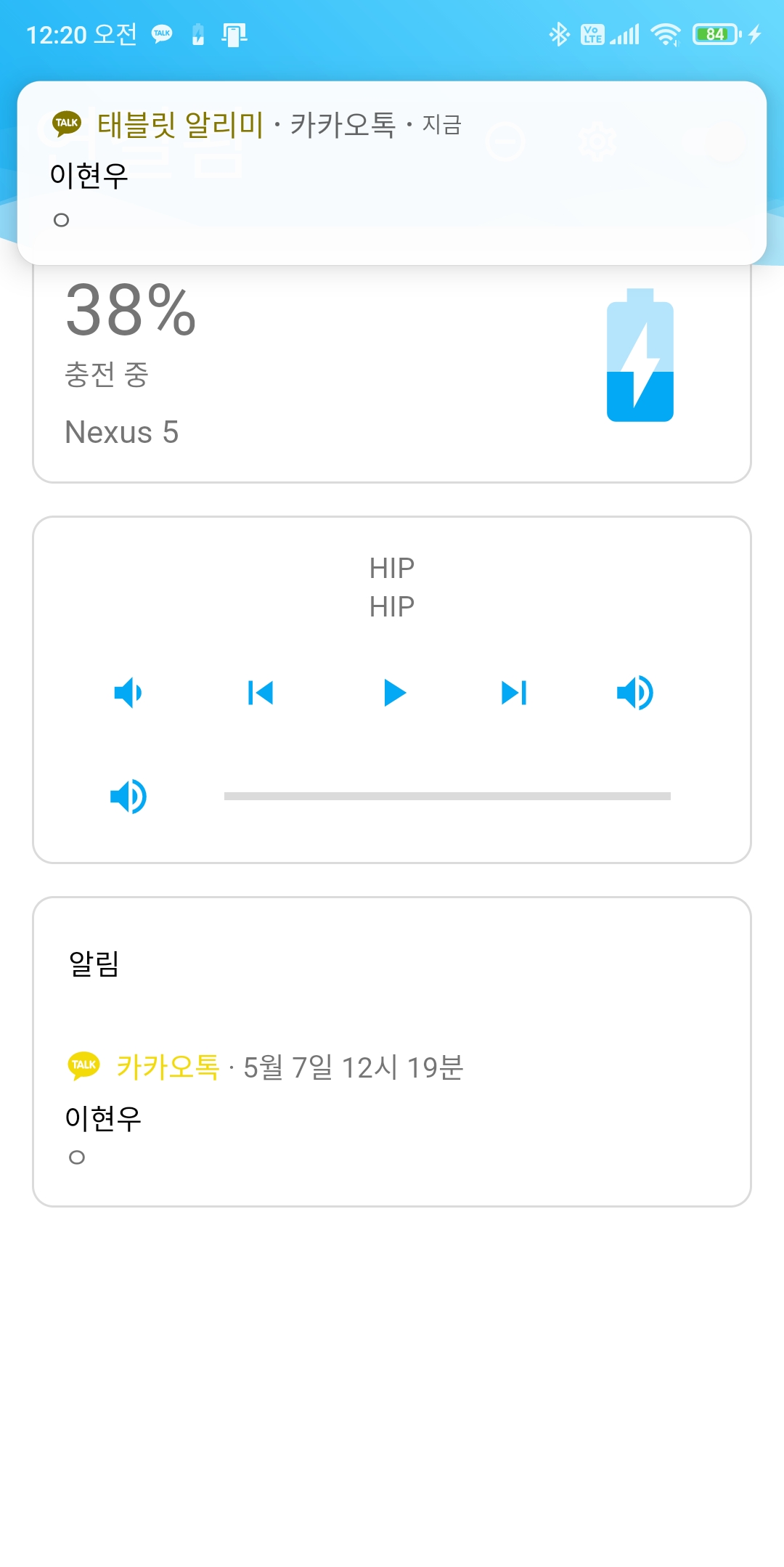 이렇게 바뀌고 있다. 항상 메인에 배터리랑 미디어를 띄우고 싶다고 생각'만' 하고 그러지 않았는데, 지금 구현하고 나름 잘 작동하는 것 같다. 그리고 아이콘을 그대로 가져와서 알림을 띄우고 싶었는데 전송이 잘 안 돼서 빈번하게 사용될 것으로 예상되는 앱 아이콘 (카카오톡, 페이스북, 페메, 인스타 등) 미리 넣어서 알림을 띄우는 걸로.