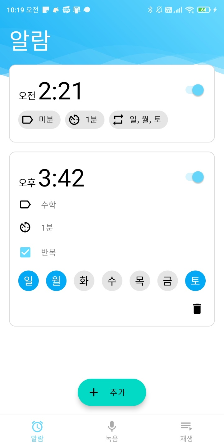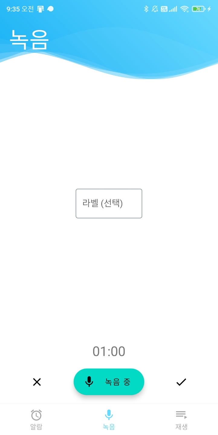 톡방의 피드백으로 요일 글자 색을 바꾸었다. 선택했을 때는 흰색으로. 다크 모드에서는 어떻게 해야 되려나? 그리고 녹음 탭에서 UI를 약간만 구현했다. 오늘은 다른 일이 있어서 거의 개발을 하지 못했다. 핵심 기능도 구현했으니 쉬엄쉬엄 하고 있는데, 어쨌든 녹음 일시정지가 API 24부터 된다. 근데 minSDK가 23이라서 23 마시멜로우 버전에서는 어떻게 해야될 지 모르겠다.