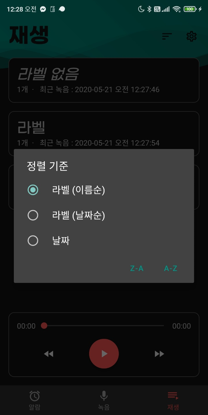 정렬 버튼 테스트한다고 토스트를 빼 놓지 않았네. 하여튼 파일만 쫙 보게 할 수도 있고 라벨별로 볼 수도 있으며, 라벨별에서는 이름순 날짜순이 다 된다. 라벨 아니고 전체 이름순은 어차피 라벨이 이름순이나 다를 바가 없어서 빼버렸다. 이제 남은 작업은 온보딩에서 권한을 얻어오고, 녹음 화면을 약간 수정하고, Play 스토어 등록 정보를 준비하면 될 것 같은 느낌이 든다.