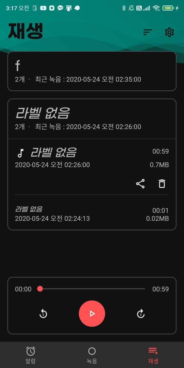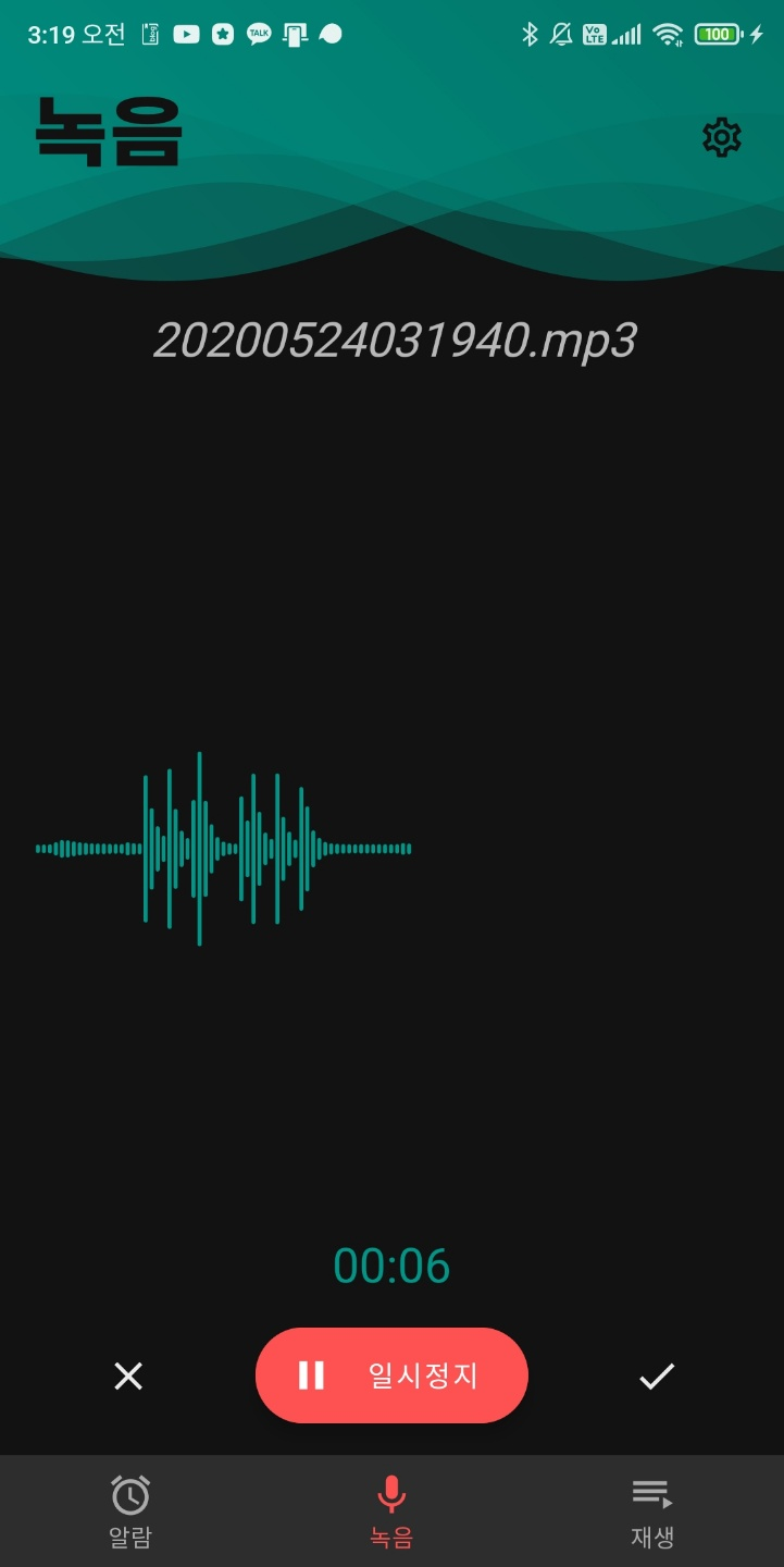 토요일이라는 특성을 살려 꽤 많은 작업을 한 날인데, 먼저 재생 탭에서는 드디어 현재 선택한 파일의 공유 및 삭제 버튼을 추가하였다. 그리고 녹음 탭은 이 앱에서 정말 부가적인, 추가적인 기능을 맡고 있는데 그렇지만 기본적인 앱 수준은 되어야 하므로 약간의 UI가 추가되었다. 녹음 Visualizer가 추가되었다. 일시정지는 현재 API 23에서 지원되지 않는다는 것을 명시해 두어야겠다.