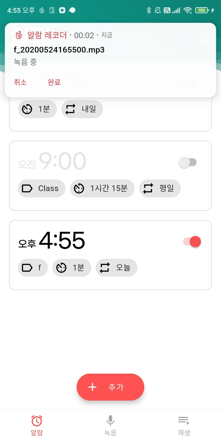 녹음 탭에서의 레코더와 알람 레코더(서비스)가 파편화되어 있어 이를 통합시키는 작업 중이다. 그리고 아무리 그냥 녹음기라고 한들 명색이 알람 레코더인데. 그래서 타이머 기능을 넣어두기로 했다.
