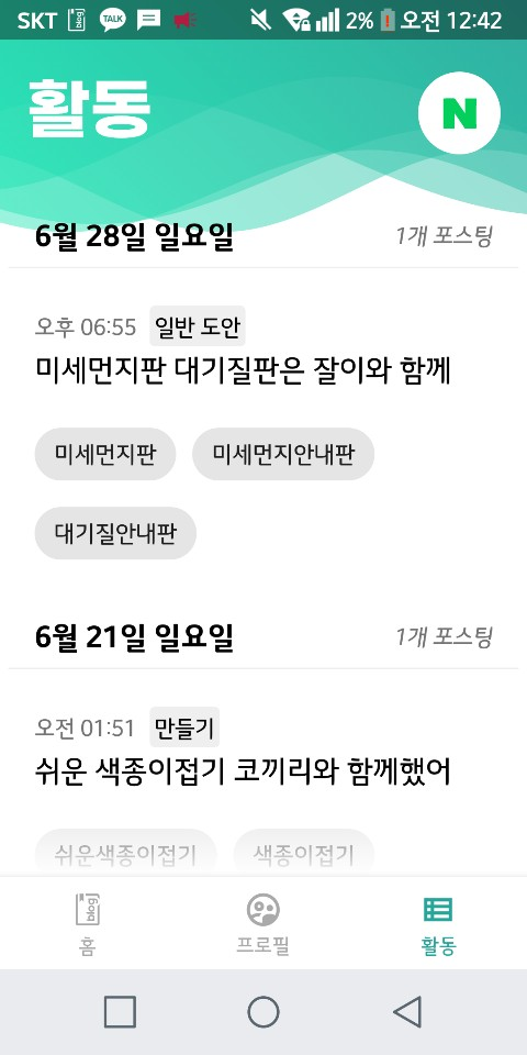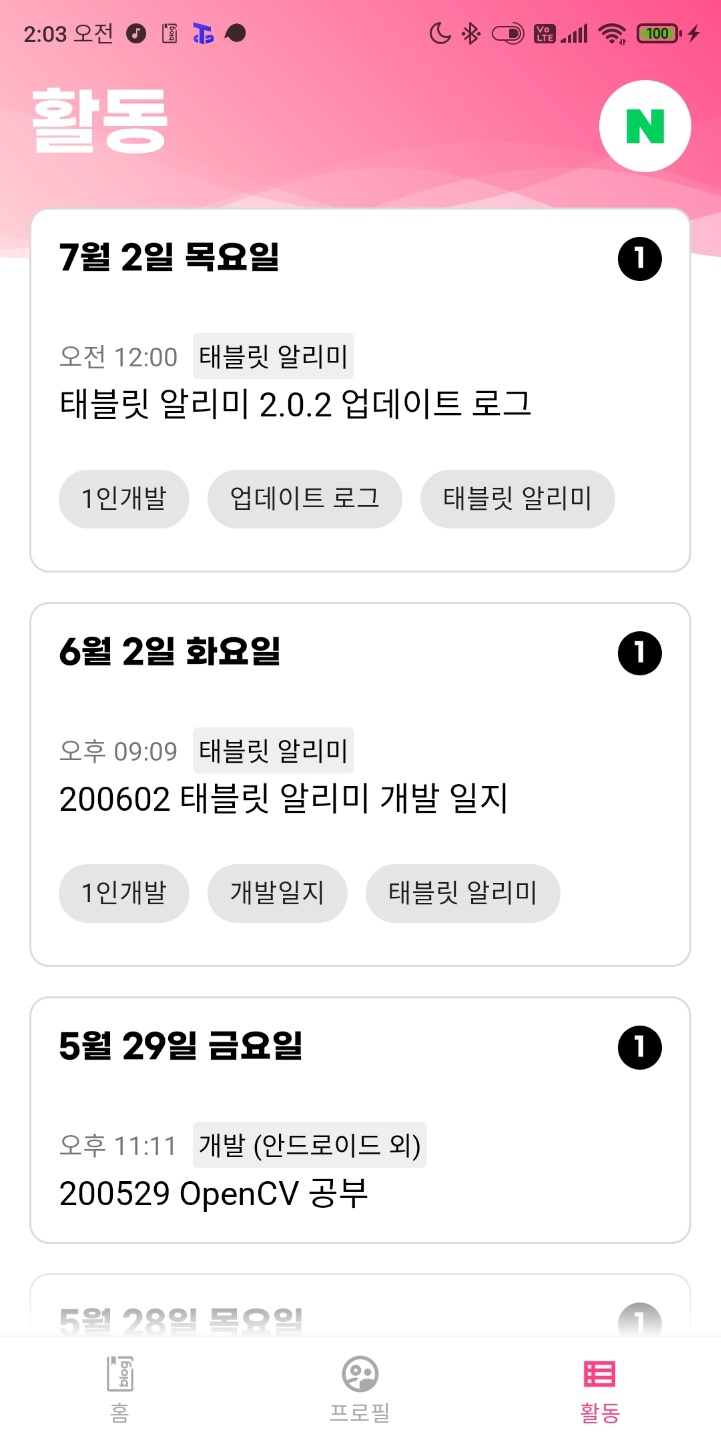 그 중 하나가 오늘 작업한 부분인데, 활동 탭을 태블릿 알리미 및 이르케 헤어 패밀리룩과 맞추어 작업하였다. 더하여 이렇게 하는 게 날짜별로 보기 쉽도록 한 것 같아 이렇게 해 두었다.