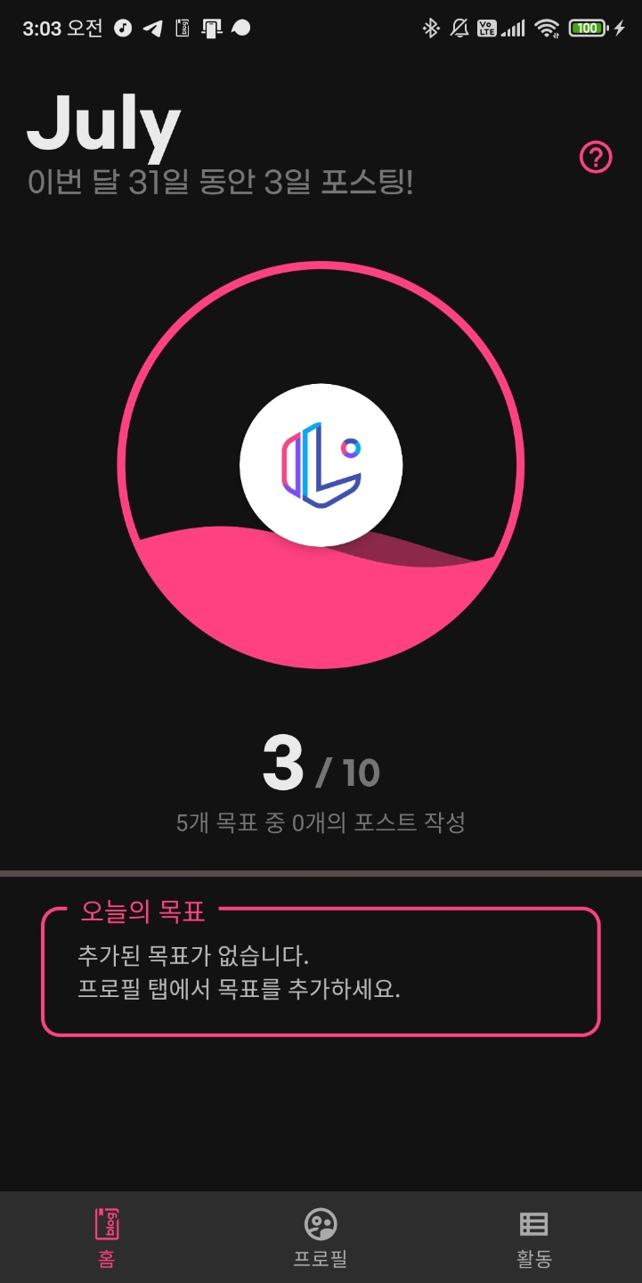 이제 UI가 조금 정리되었다. 원래는 그냥 구분선이 있는 자리였는데 (기능 無) 저걸 프로그래스바로 변경했다. 그리고 원래는 "5개 목표 중 0개의 포스트 작성" 안내가 3/10 누르면 목표 바꿀 수 있다 그런 안내였는데 드디어 기능을 띠게 되었다. 대신 3/10 누르면 목표 바꾸는 건 없어졌고, 메인에서 보여주는 목표가 두 개(포스트 갯수, 포스트 연속 작성 여부)이기 때문에 따로 설정으로 이동했다.