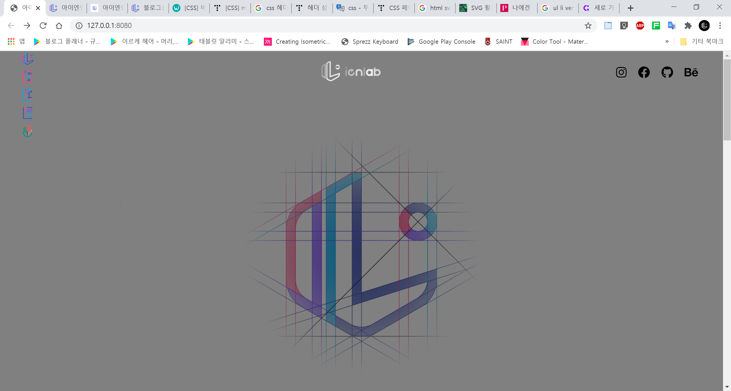 오른쪽에 instagram, fb, github, behance 아이콘을 추가했고, 로고와 앱 아이콘을 추가했다. 저 친구들은 스크롤 인디케이터 역할을 할 것이며 세로 정렬이 필요하다. 스크롤 중에는 저 중간 위치에 고정이 되어 있어야 한다.