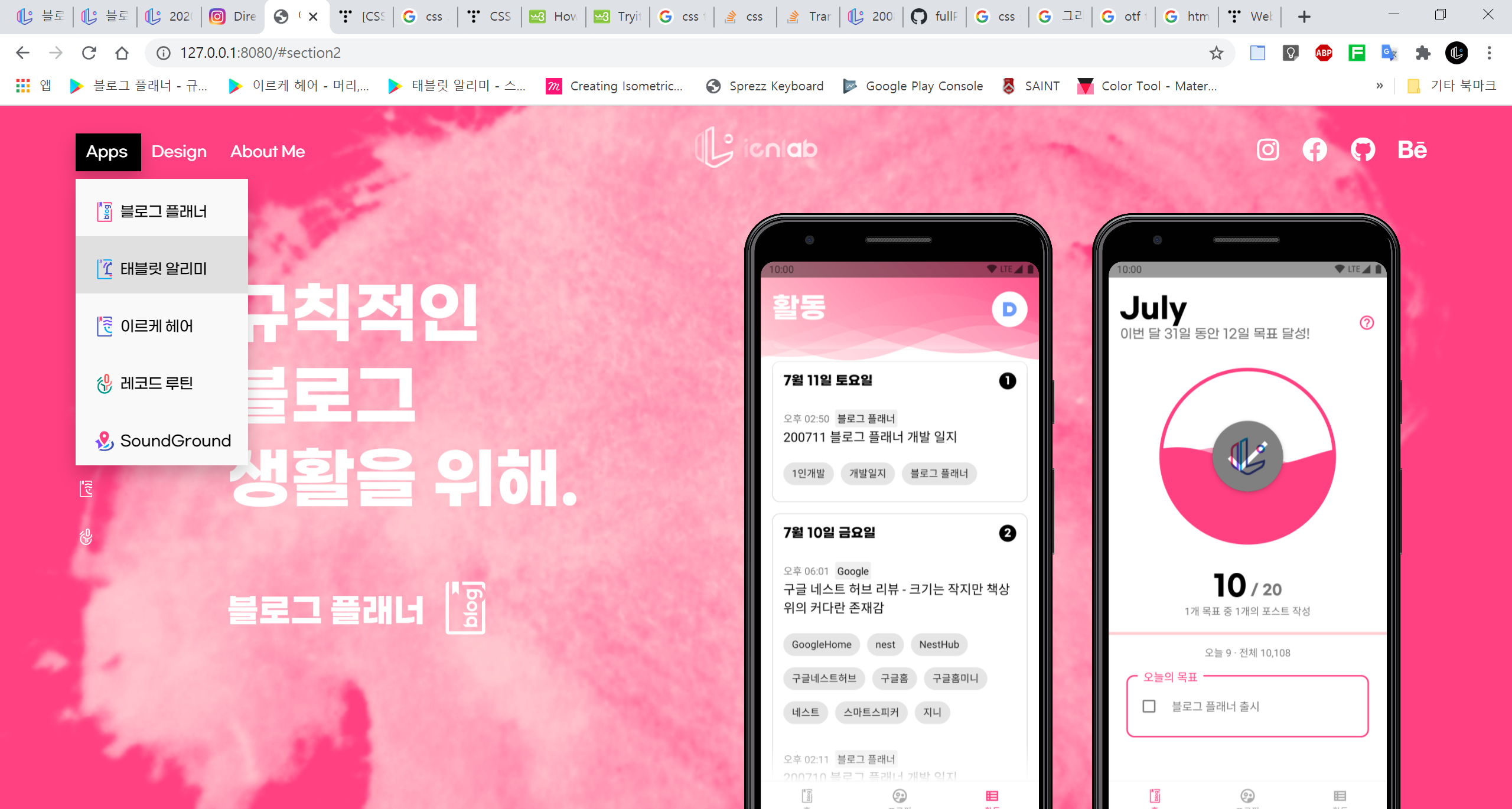 왼쪽 상단 메뉴를 추가했다. 위에 마우스 올리면 메뉴가 뜨도록 했는데 About Me에는 바로 밑에 안 뜨고 Apps 밑에 뜨는 버그가 있다. 나중에 수정해야겠다. 그리고 transition이 너무 좋다. 흐히
