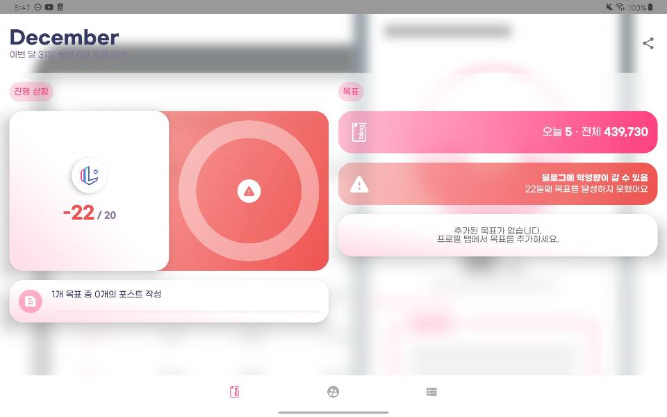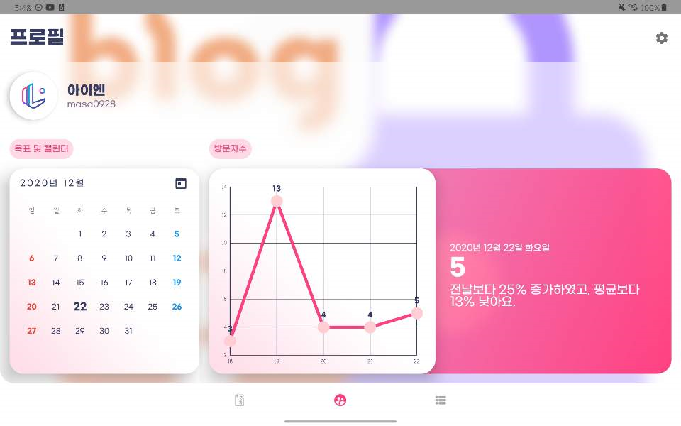 먼저 첫번째 작업은 태블릿 UI 작업이다. 저번 버전(2.5.0)부터 태블릿 UI를 지원하고 있다. 그런데 태블릿 가로 모드로 보면 보기 싫게 늘어나서 홈 탭, 프로필 탭은 태블릿 전용 UI를 해 두었다. 리디자인된 UI도 보기 좋게 태블릿 전용 UI로 고쳐 두었다. 저번 버전은 폰과 태블릿 UI가 비슷한데 좀 달라서 이질감이 있었는데 이번엔 한 맥락을 공유하고 있어서 보기가 저번보다 나은 듯하다.