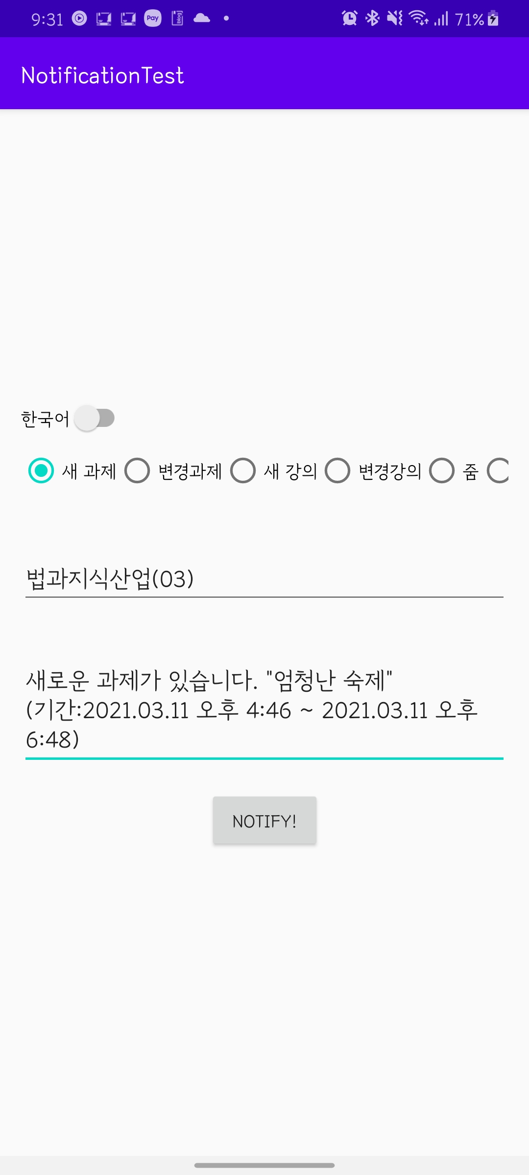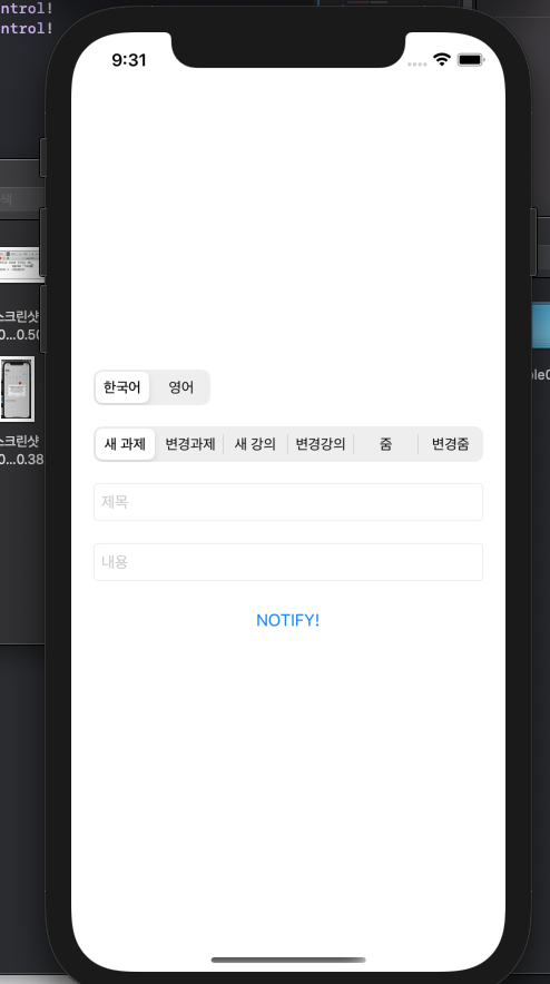 오늘은 iOS용 알림 테스트를 만들었다. UI는 거의 같다. 이건 뭐 나 혼자 쓰기 위한 테스트 앱이기 때문에? 큰 차이는 없는데 은근 이것도 재밌다. 아직 밖에 껍데기밖에 안 됐다. 알림은 저 텍스트 내용대로 되고, value change일 때 텍스트를 setText할 수 있도록 할 것이다.