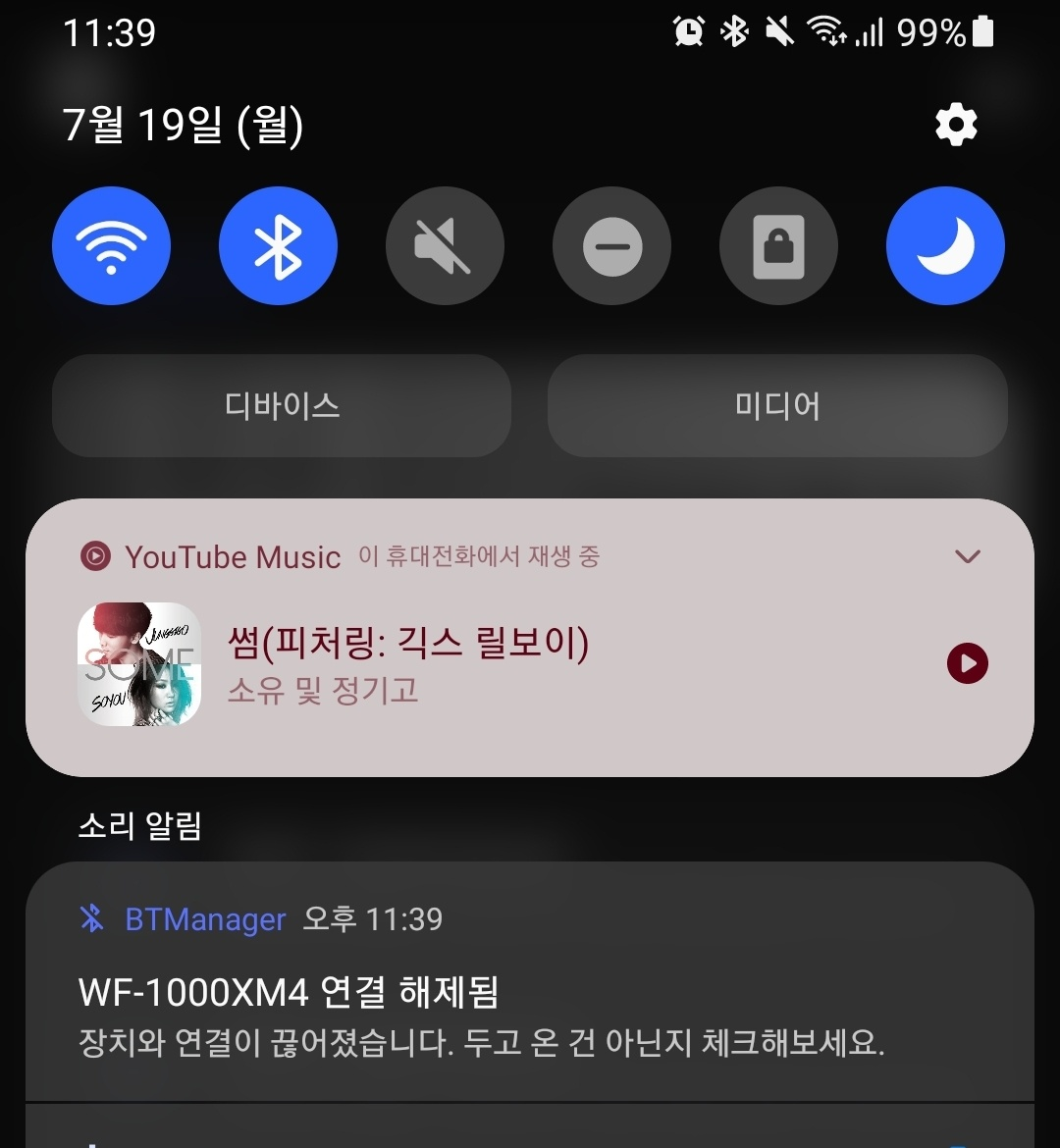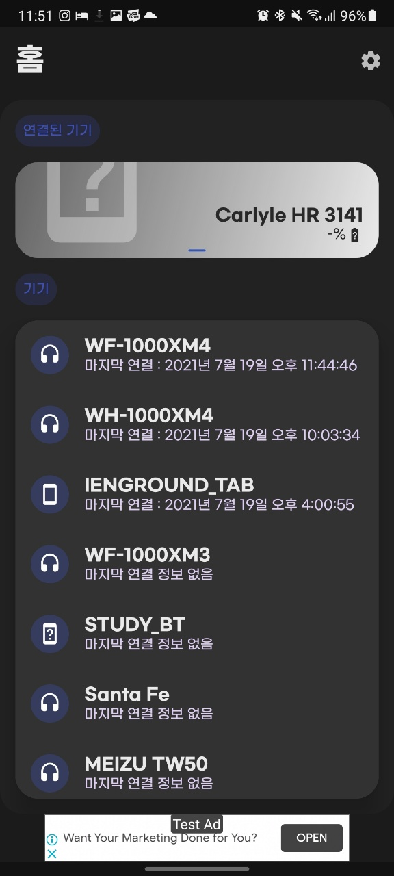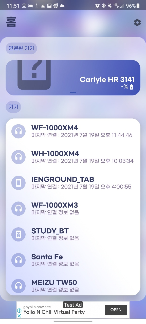 계속 생각해도 홈 화면이 너무 단조로워서 어떻게 하지 싶었는데 현재 연결된 건 사실 많은 공간을 차지할 필요가 없는 것이였다. 그래서 좌우 슬라이드 형식으로 바꿨더니. 디자인이 훨 좋아졌다. 이어폰의 경우에는 배터리 정보를 얻어올 수 있기 때문에, 배터리도 표시해주고 있다.