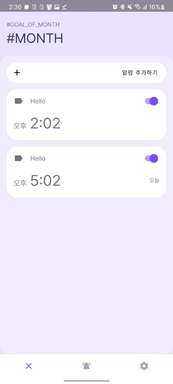 아마도 다이얼로그에서 다시 Expand로 하려고 했다가, 그냥 새 창으로 띄우기로 했다. 그래서 표시되는 내용은 라벨, 시간, 요일, 활성화 정도가 될 것 같음