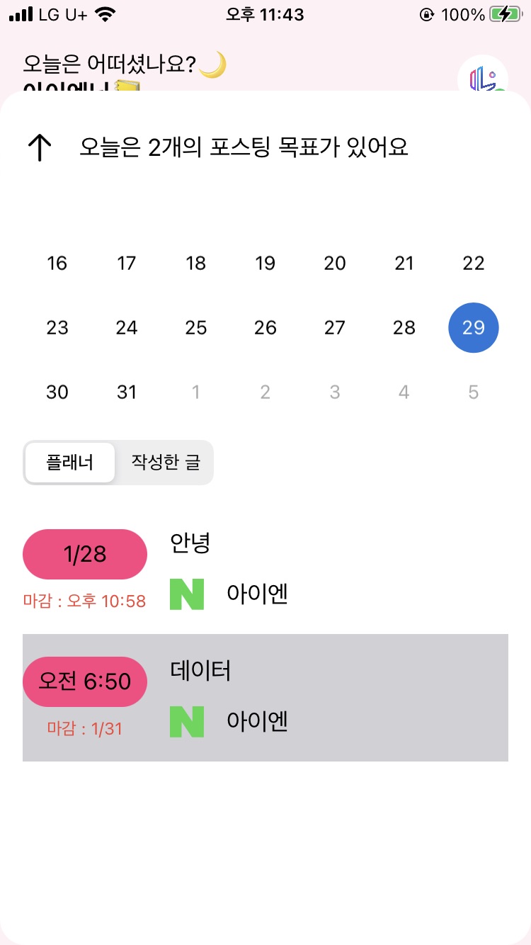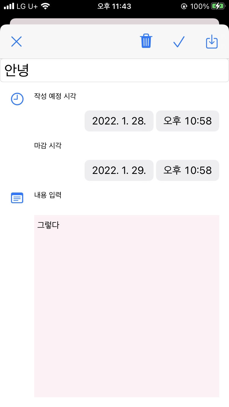 현재 클릭했을 때 창과 데이터가 올바르게 되었다. 이제 작성한 글 부분이랑 설정, 그리고 주기적 알람을 설정해주면 거의 마무리된다. 목표는 1/31 완료이다.