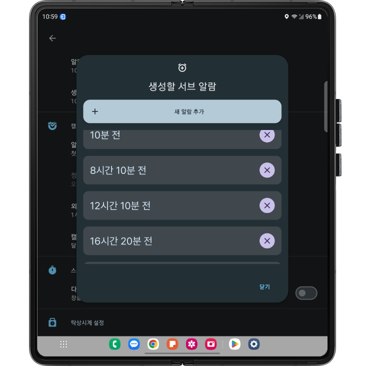 그리고 이건 fadingEdge 테스트를 하려고 서브 캘린더 알람을 만들다가 알게 된 사실인데, 알람 및 캘린더 알람의 서브 알람을 추가하면 chip이 추가된다. 그런데 이게 밑으로 줄줄 끌린다는 사실을 확인하지 못했었다. 그래서 아마 얘들은 내일 오전 중으로 타이머 화면과 같이 서브 알람 수와 chip 한 줄로 하고 횡스크롤이 가능하게 만들 것 같다.