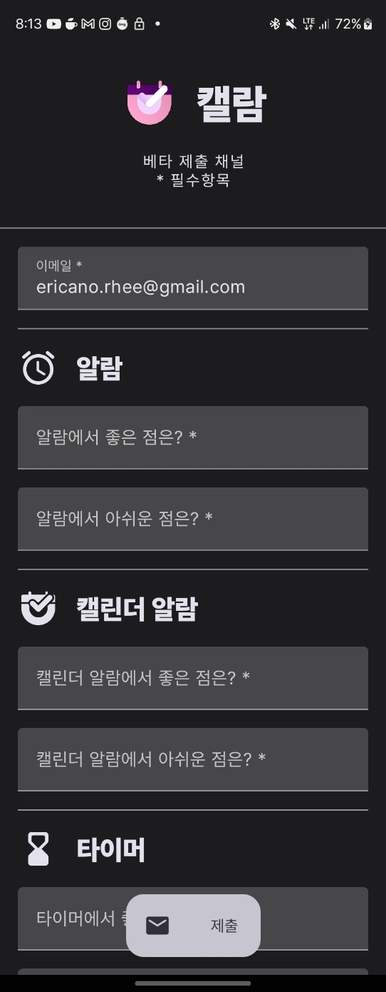 이건 구글 폼과 앱을 연결시켜 놓았는데, 앱 내에서 의견을 쉽게 제출할 수 있도록 한 것이다. 그래서 제출을 누르면 내 구글 폼으로 의견이 온다. 이것은 새로운 경험 겸 의견을 받기 위해 만든 것. 베타테스트 버전, 안드로이드 버전, 휴대폰 기종이 자동으로 전송된다.