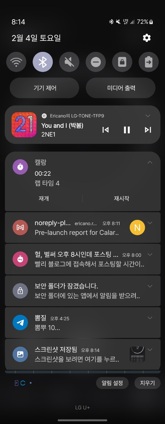 요건 타이머. 노티피케이션에 이제 랩스/재시작이 가능하고 현재 play 상태일 때 랩스 기록, pause 상태일 때 재시작이 가능하게 action을 지정해 두었다. 랩스 개수도 나옴.