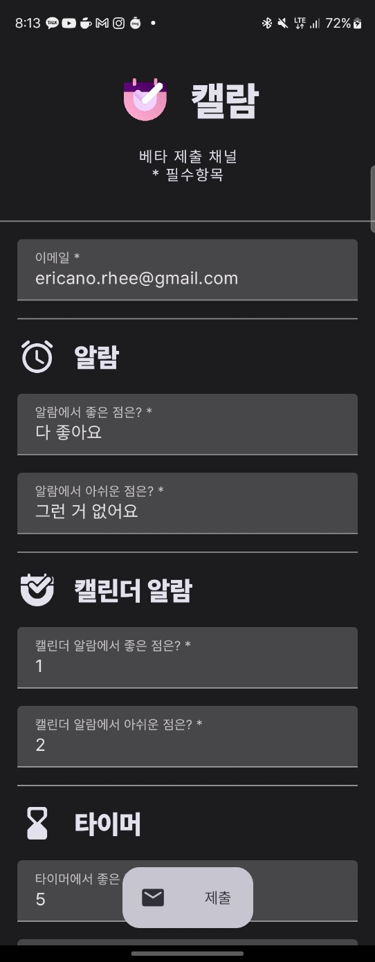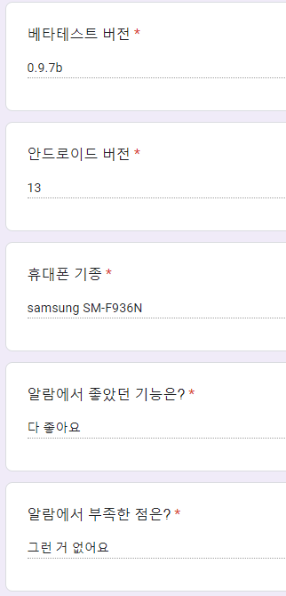 이건 구글 폼과 앱을 연결시켜 놓았는데, 앱 내에서 의견을 쉽게 제출할 수 있도록 한 것이다. 그래서 제출을 누르면 내 구글 폼으로 의견이 온다. 이것은 새로운 경험 겸 의견을 받기 위해 만든 것. 베타테스트 버전, 안드로이드 버전, 휴대폰 기종이 자동으로 전송된다.