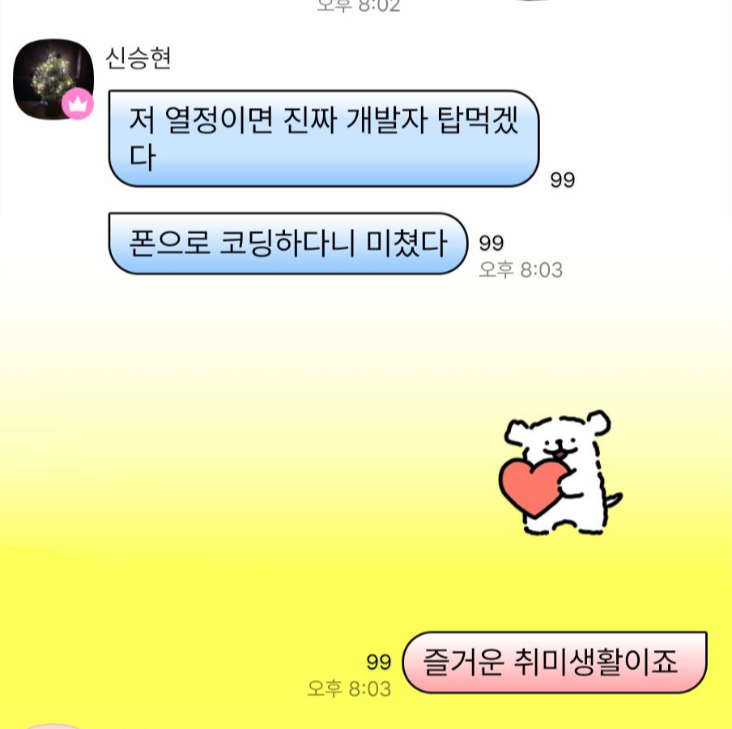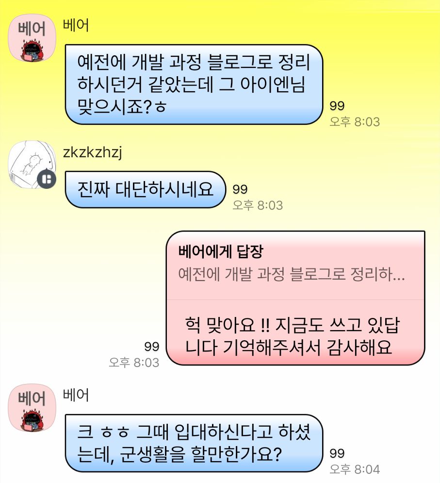 휴대폰으로 개발했다니까 반응이 재밌다.. 열정이라고 하기엔 너무 부끄러운 수준이고 그냥 취미생활 .. 그나저나 앱개발자들 여러 명 있는 방인데 개발 일지 올렸더니 그때의 나를 기억해주는 분이 보인다. 입대한다고 했을 때니까 꼭 1년 전인데 그걸 어떻게 기억하시지? 여튼 감사한 일.