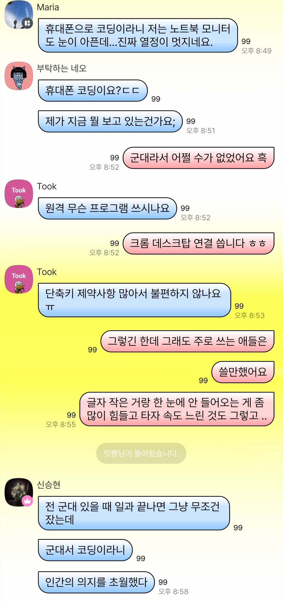 휴대폰으로 개발했다니까 반응이 재밌다.. 열정이라고 하기엔 너무 부끄러운 수준이고 그냥 취미생활 .. 그나저나 앱개발자들 여러 명 있는 방인데 개발 일지 올렸더니 그때의 나를 기억해주는 분이 보인다. 입대한다고 했을 때니까 꼭 1년 전인데 그걸 어떻게 기억하시지? 여튼 감사한 일.