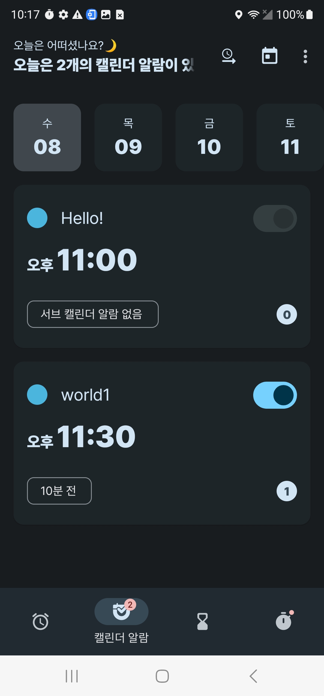서브 캘린더 알람, 서브 알람 등의 경우 텅 비었다고 메시지를 주는 게 좋을 것 같다.