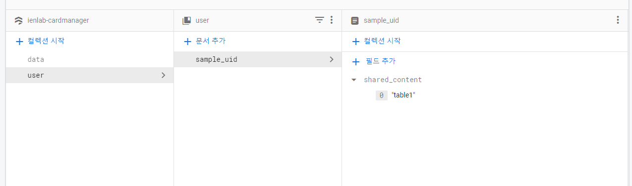 user 컬렉션에는 많은 값을 유지할 필요가 없다. 왜냐면 username, email, profile_url 등은 실시간으로 받아오면 되고 딱히 유저의 정보를 활용할 애들이 없기 때문이다. 필요한 건 이 유저가 공유받은 table이 뭔지, shared_content array를 통해 관리하는 것이다.