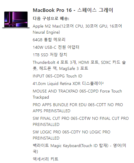 M2 Max인데 좀 타협봐서 GPU는 30코어로 내리고, 1TB에 램은 결국 64를 때려박았다. 2030년까지는 써야 안 되겠나 싶어서... 그리고 모니터는 일단 내가 집에 들어가고 사야겠다.