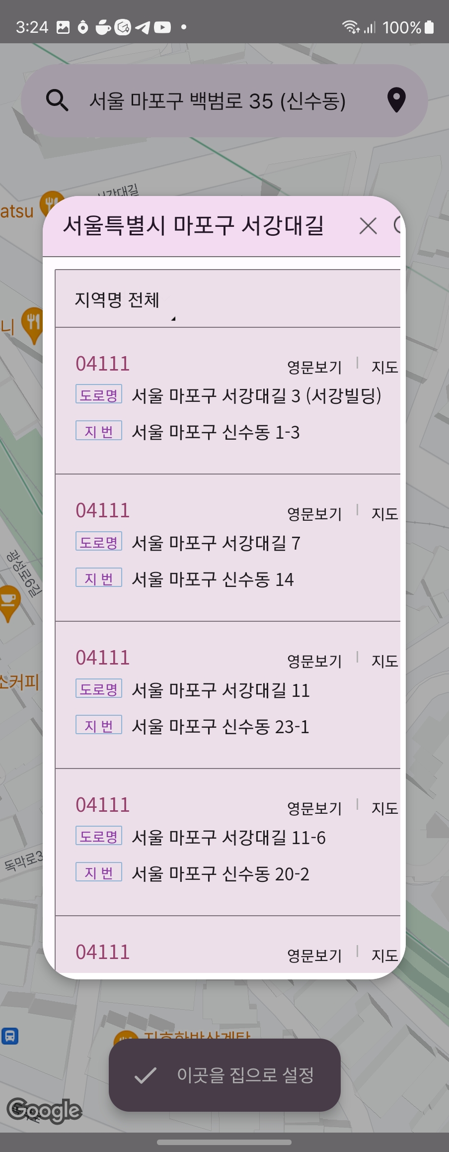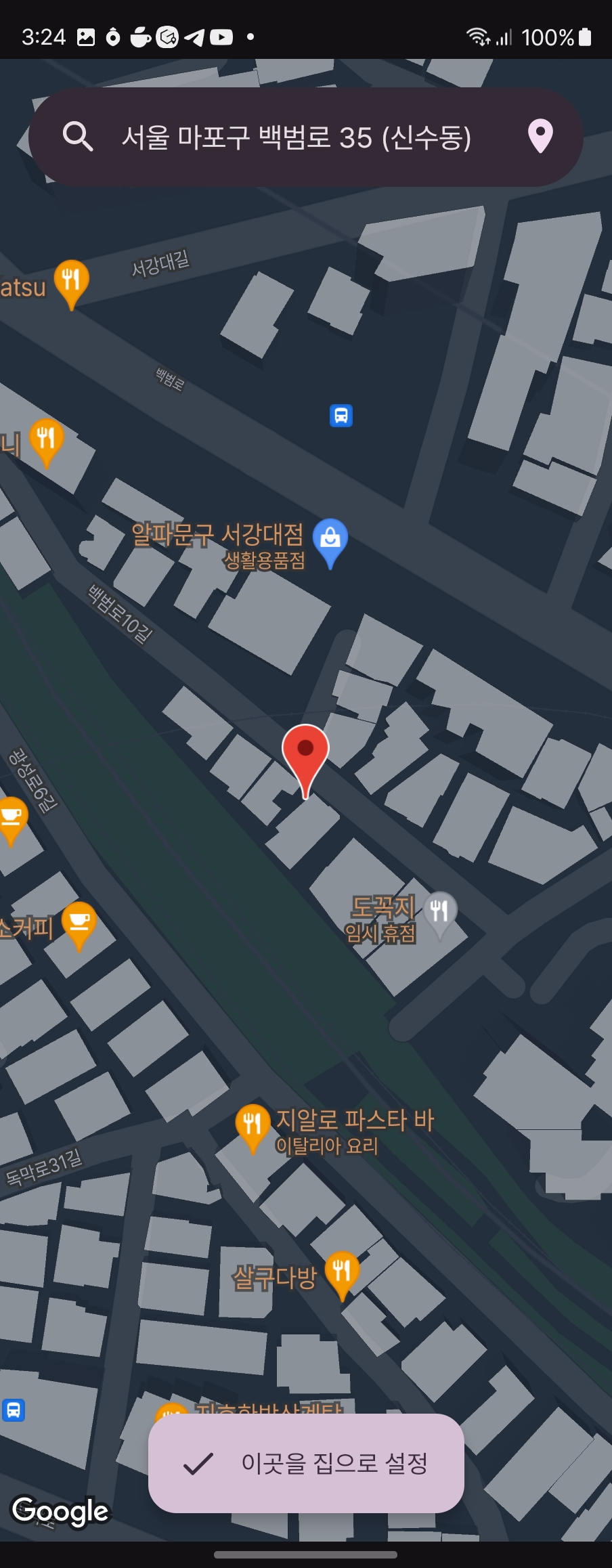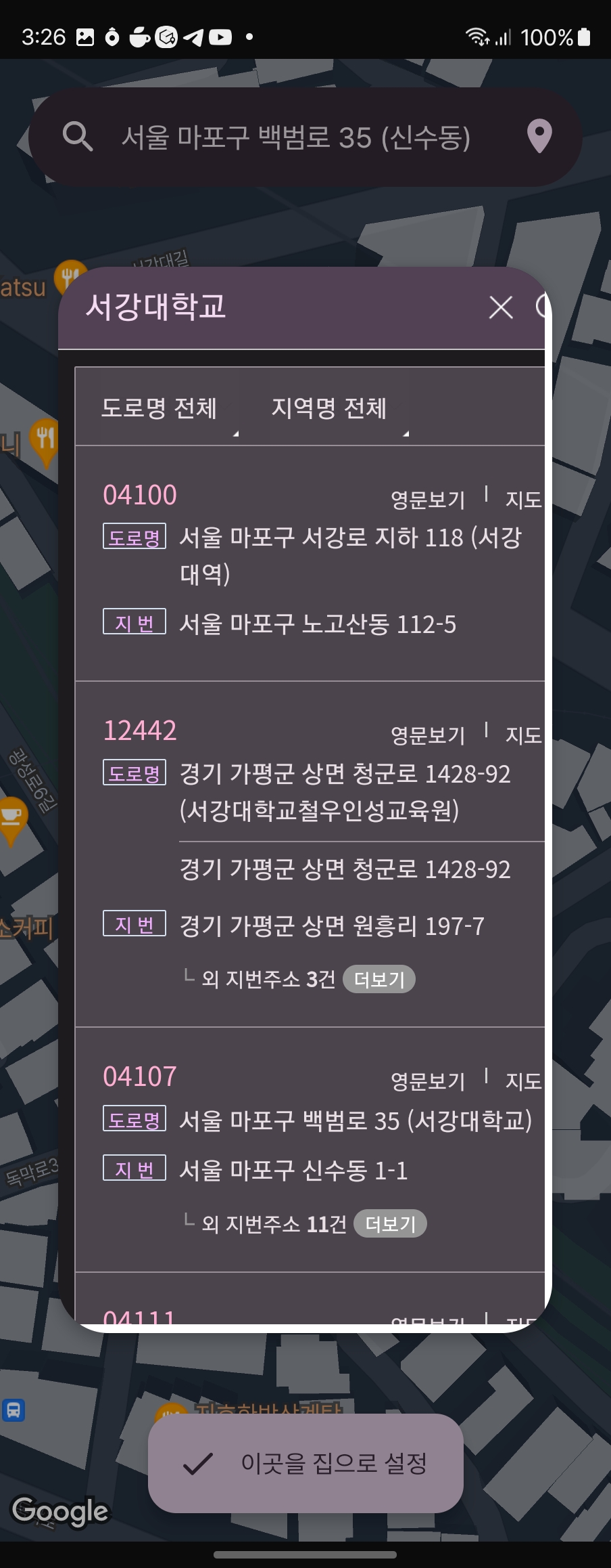 집 설정하는 화면도 디자인이랑 기능을 추가했다. 원래는 직접 찾거나 현재 위치로 할 수 있었는데 일단 위치가 좀 이상했다. 이거 수정하고, 다음 주소 검색 api 넣었다. 이거 개인 서버 없어서 하기 힘들었는데 Firebase (오늘도 갓파베) 호스팅이 있어서 거기에다 올리고 썼다. 여기서 현재 테마의 색을 서버로 보내서 테마에 맞게 색깔 입히는 것까지 했다 :> 그리고 지도도 다크 모드 되게 변경.