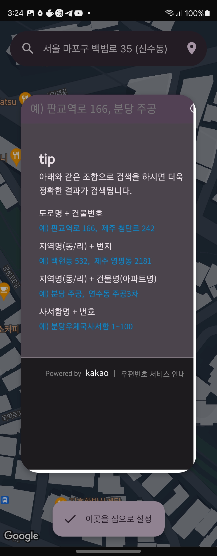 집 설정하는 화면도 디자인이랑 기능을 추가했다. 원래는 직접 찾거나 현재 위치로 할 수 있었는데 일단 위치가 좀 이상했다. 이거 수정하고, 다음 주소 검색 api 넣었다. 이거 개인 서버 없어서 하기 힘들었는데 Firebase (오늘도 갓파베) 호스팅이 있어서 거기에다 올리고 썼다. 여기서 현재 테마의 색을 서버로 보내서 테마에 맞게 색깔 입히는 것까지 했다 :> 그리고 지도도 다크 모드 되게 변경.