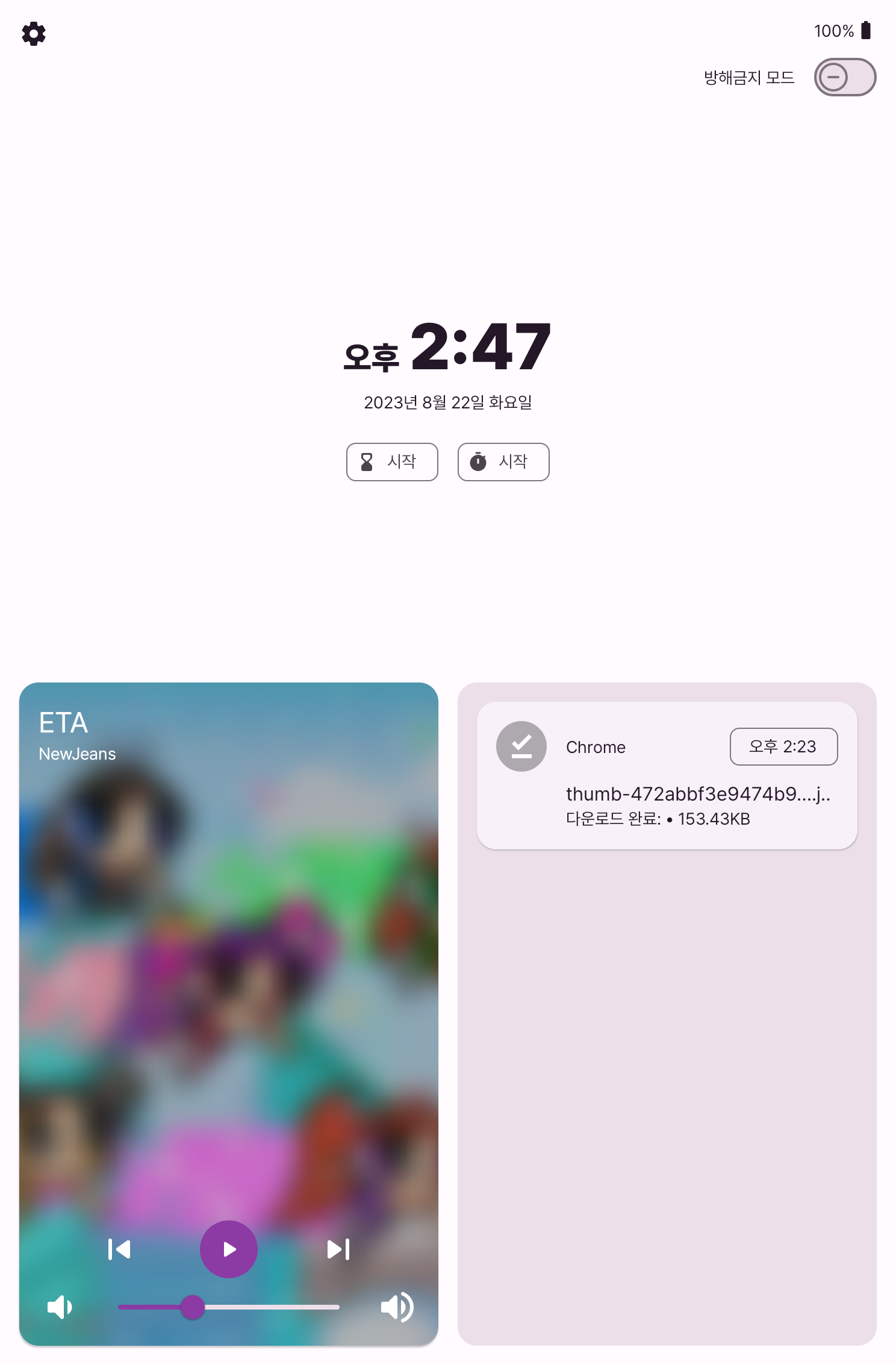 화면 보호기 기능을 추가했다. 원래 탁상시계 기능 자체도 화면 보호기 기능으로 넣었는데 정작 화면 보호기 API 적용을 안 해 놔서 (DreamService) 안 됐었는데 이번에 추가했다. 그리고 태블릿 세로 전용 UI도 넣었다. 음악 부분은 조금 더 수정을 하고 싶은데 이건 일단 이렇게 두기로 했다. 참고로 휴대폰 버전과 이미지가 달라보이는 이유는 라이브러리를 조금 바꿨다. Blurry 계속 DreamService에서는 튕기더라..