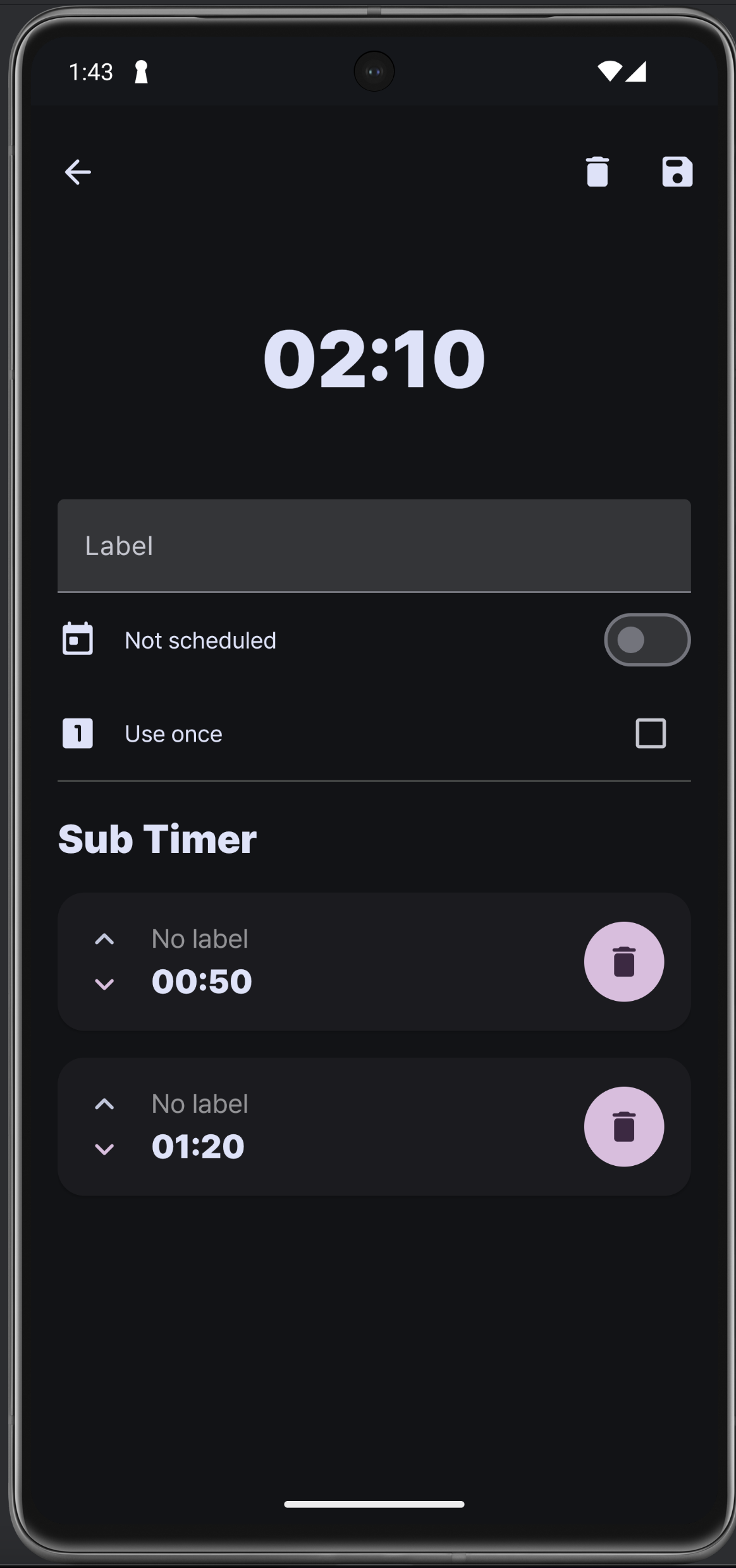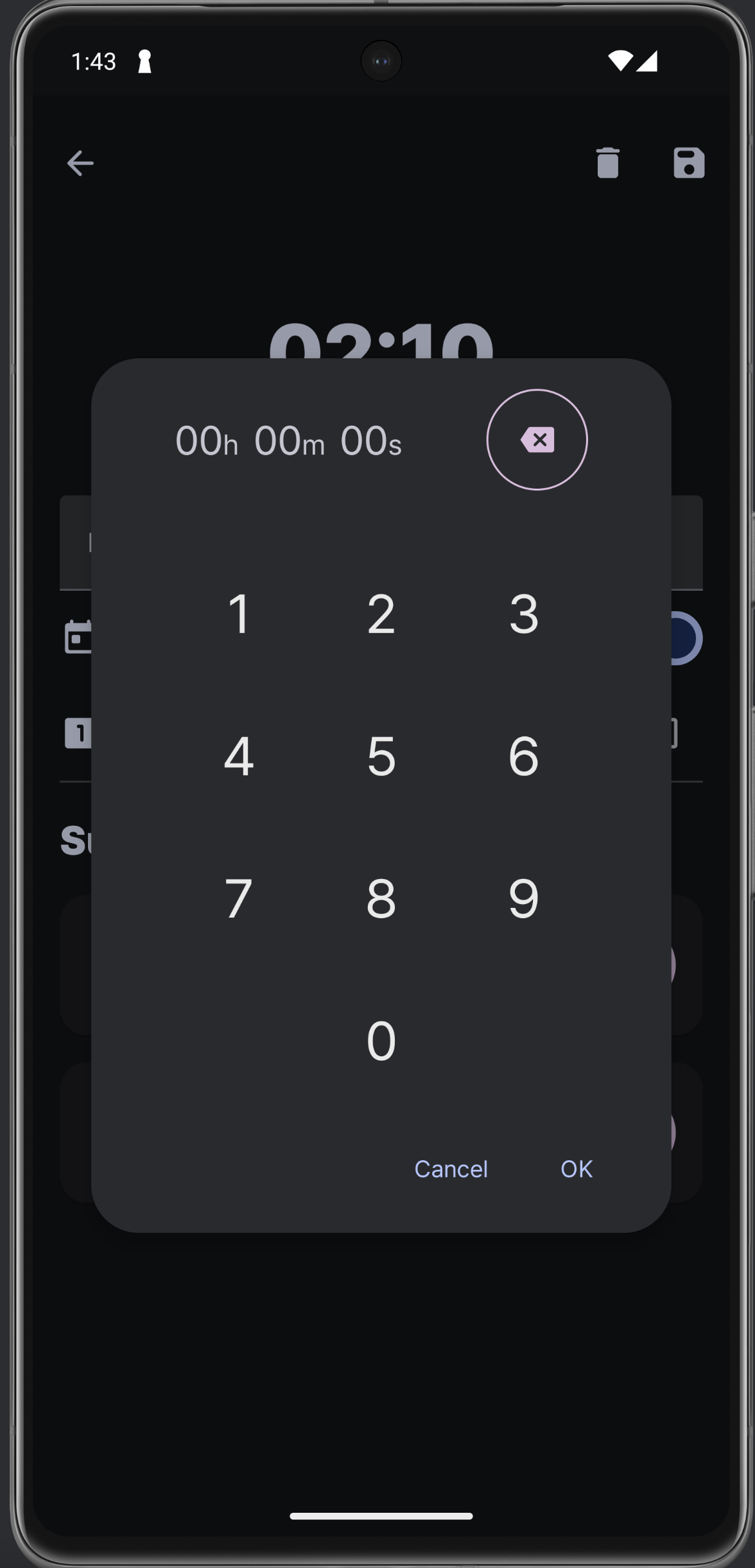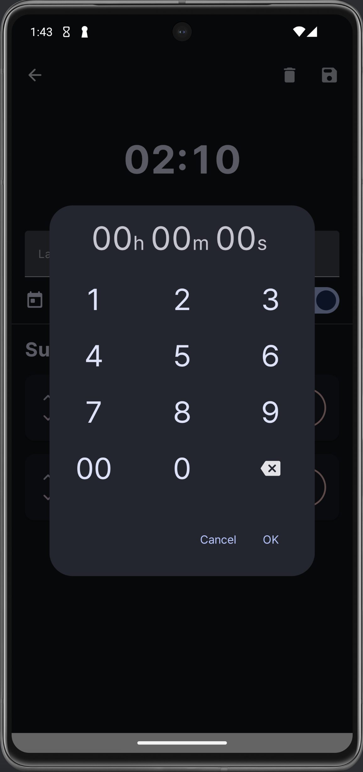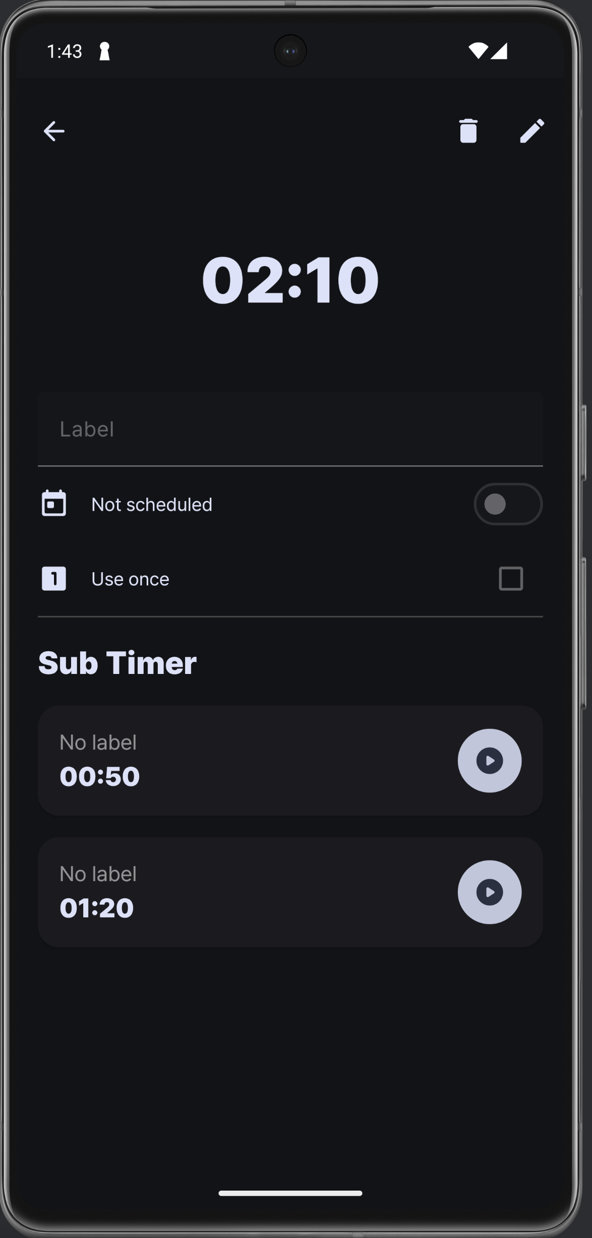 수정 창이다. 한 번만 사용은 사용자가 선택할 수 있는 부분이 아니라고 생각하고 뺐다. 그러니까 이 옵션은 타이머 생성 시에 바로 결정되고 사용되는 것. Edit mode로 진입하면 서브 타이머에 위 아래 화살표가 뜨는 건 똑같은데 애니메이션이 훨씬 자연스러워졌고, 삭제는 부정적인 색 (error 색) 으로 변경했다. 타이머 추가 다이얼로그도 위 넘패드랑 같은 형식으로 수정!