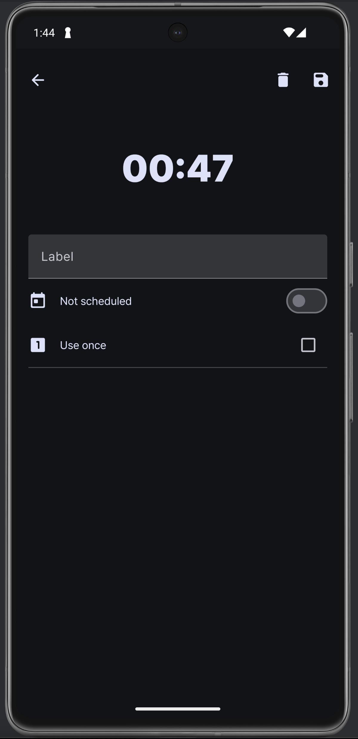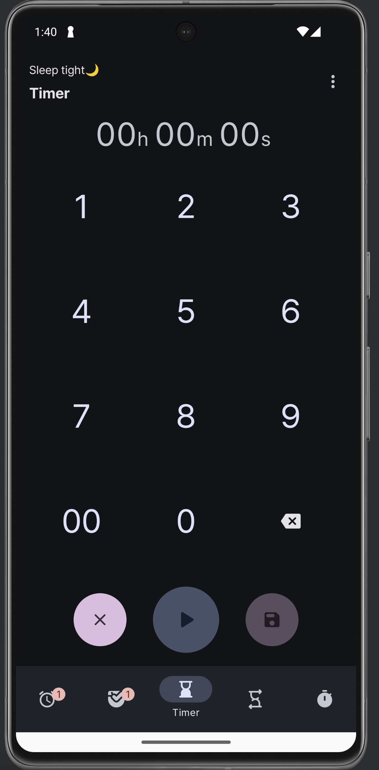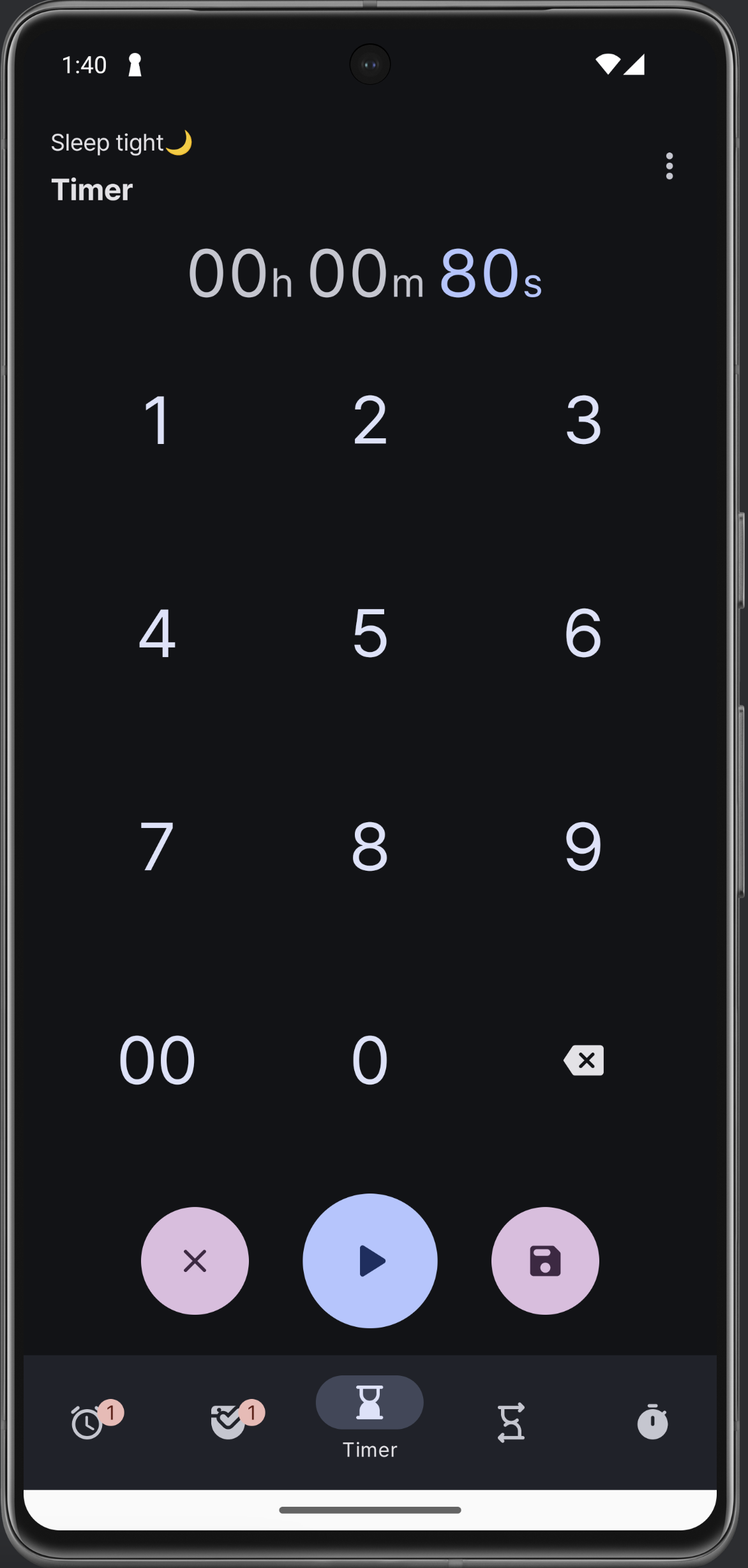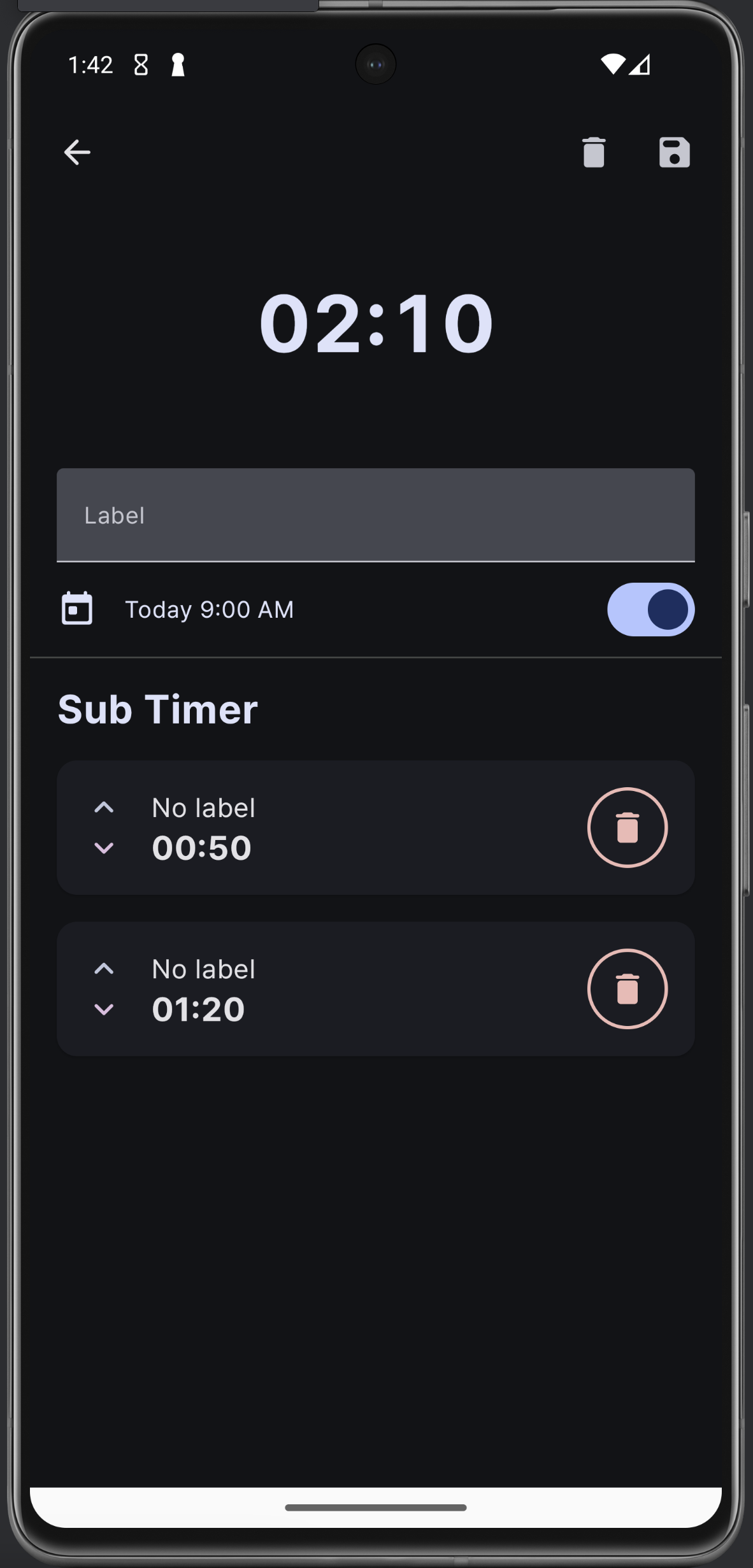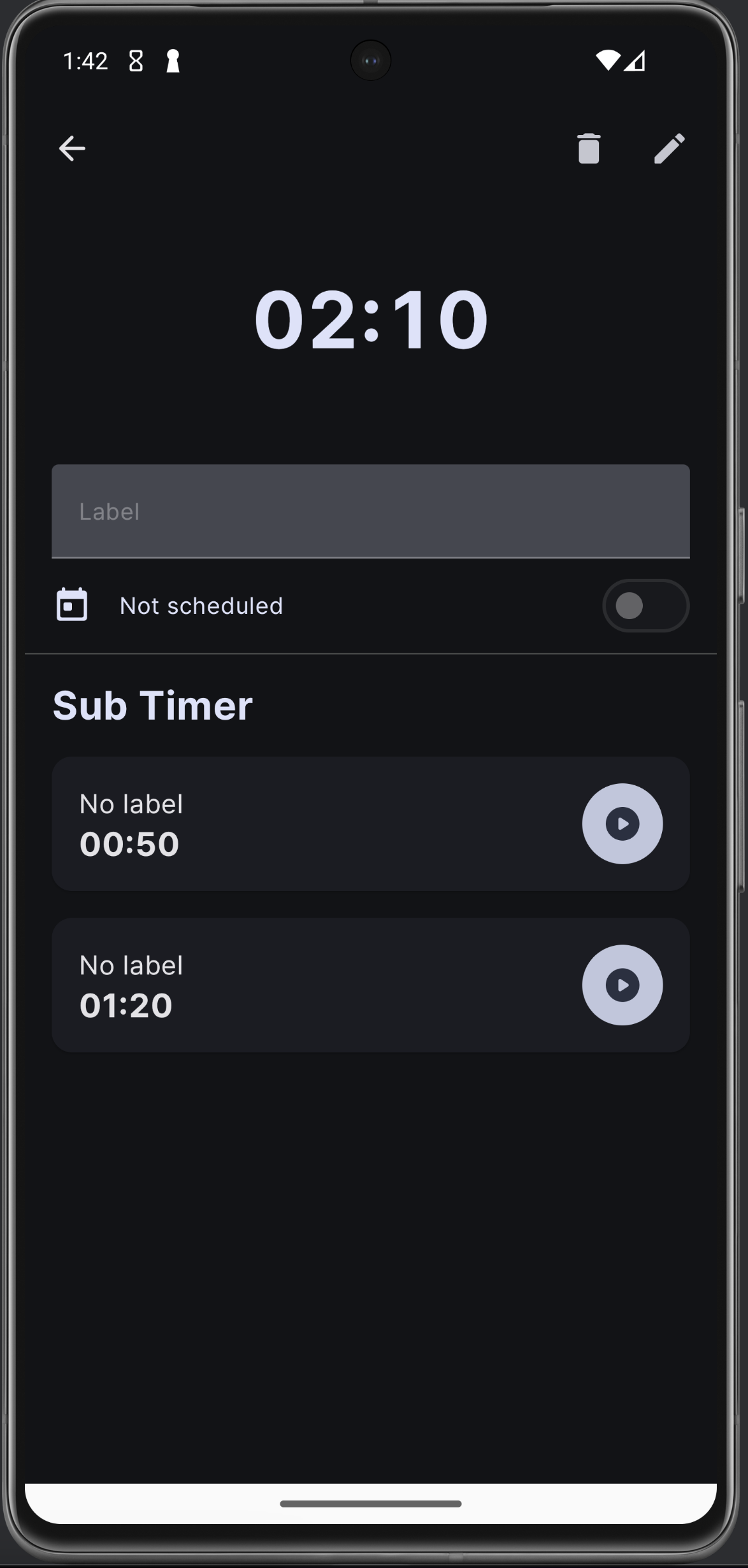 수정 창이다. 한 번만 사용은 사용자가 선택할 수 있는 부분이 아니라고 생각하고 뺐다. 그러니까 이 옵션은 타이머 생성 시에 바로 결정되고 사용되는 것. Edit mode로 진입하면 서브 타이머에 위 아래 화살표가 뜨는 건 똑같은데 애니메이션이 훨씬 자연스러워졌고, 삭제는 부정적인 색 (error 색) 으로 변경했다. 타이머 추가 다이얼로그도 위 넘패드랑 같은 형식으로 수정!