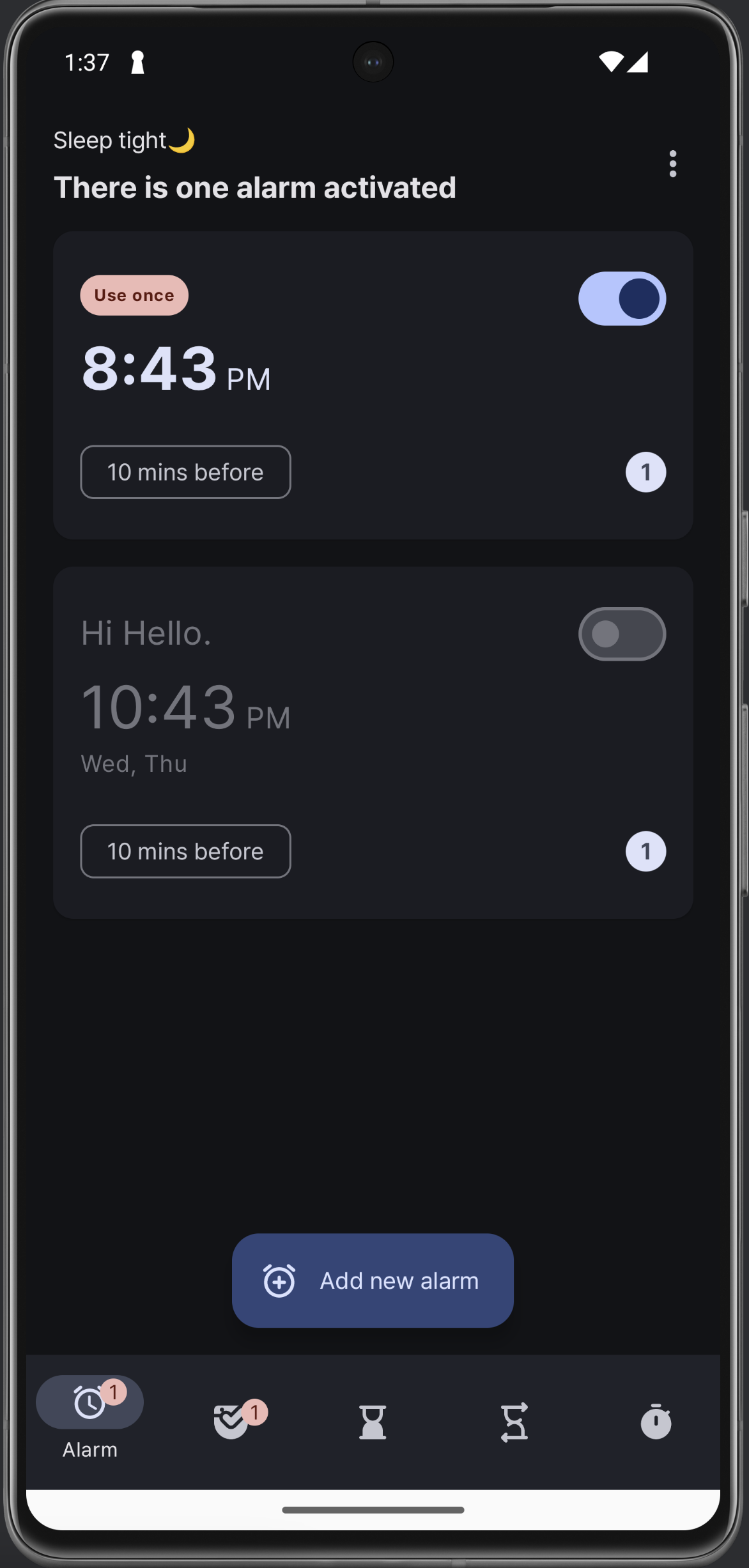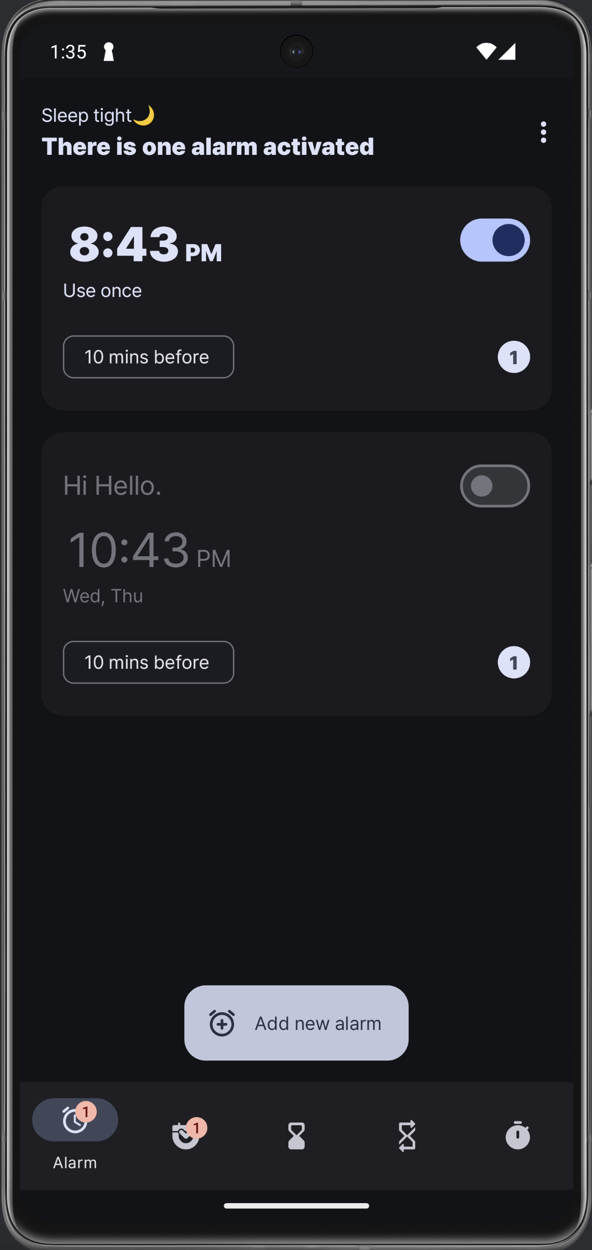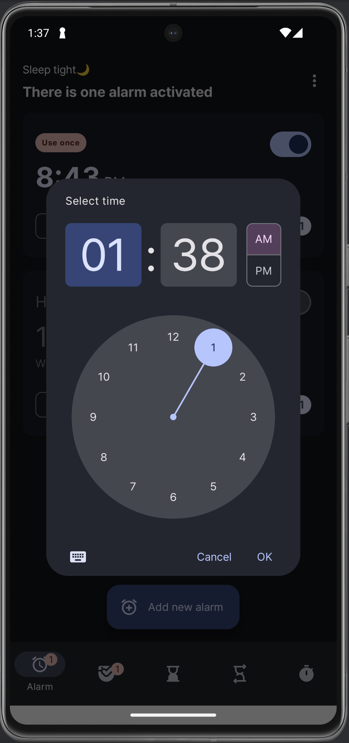 새로운 알람을 추가할 때, 기존에는 Add 창을 띄우게 했는데 이제는 그냥 시간만 바로 입력하면 생성할 수 있게 했다. 어쨌든 간단하게 만들 때는 시간이 더 중요하니까 ..