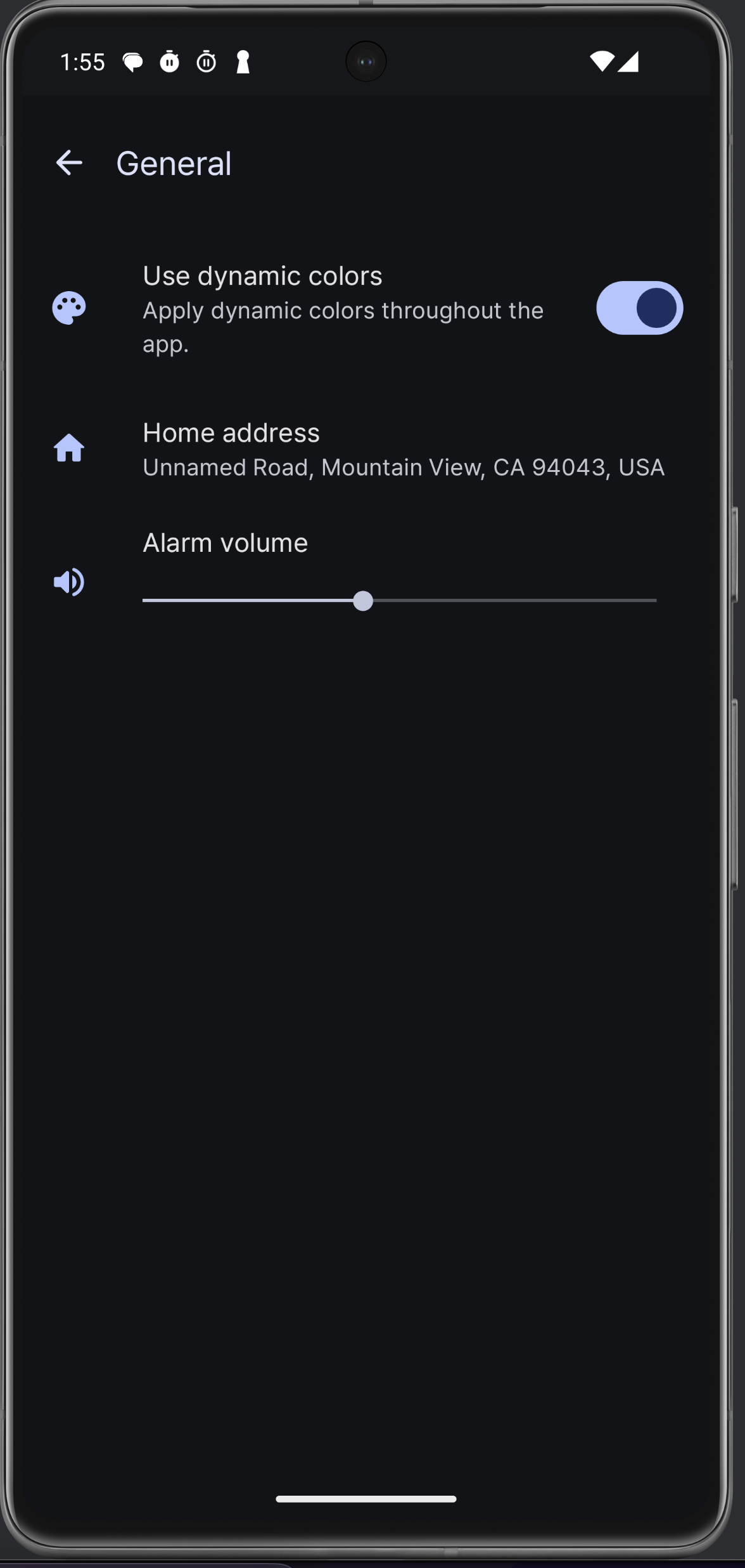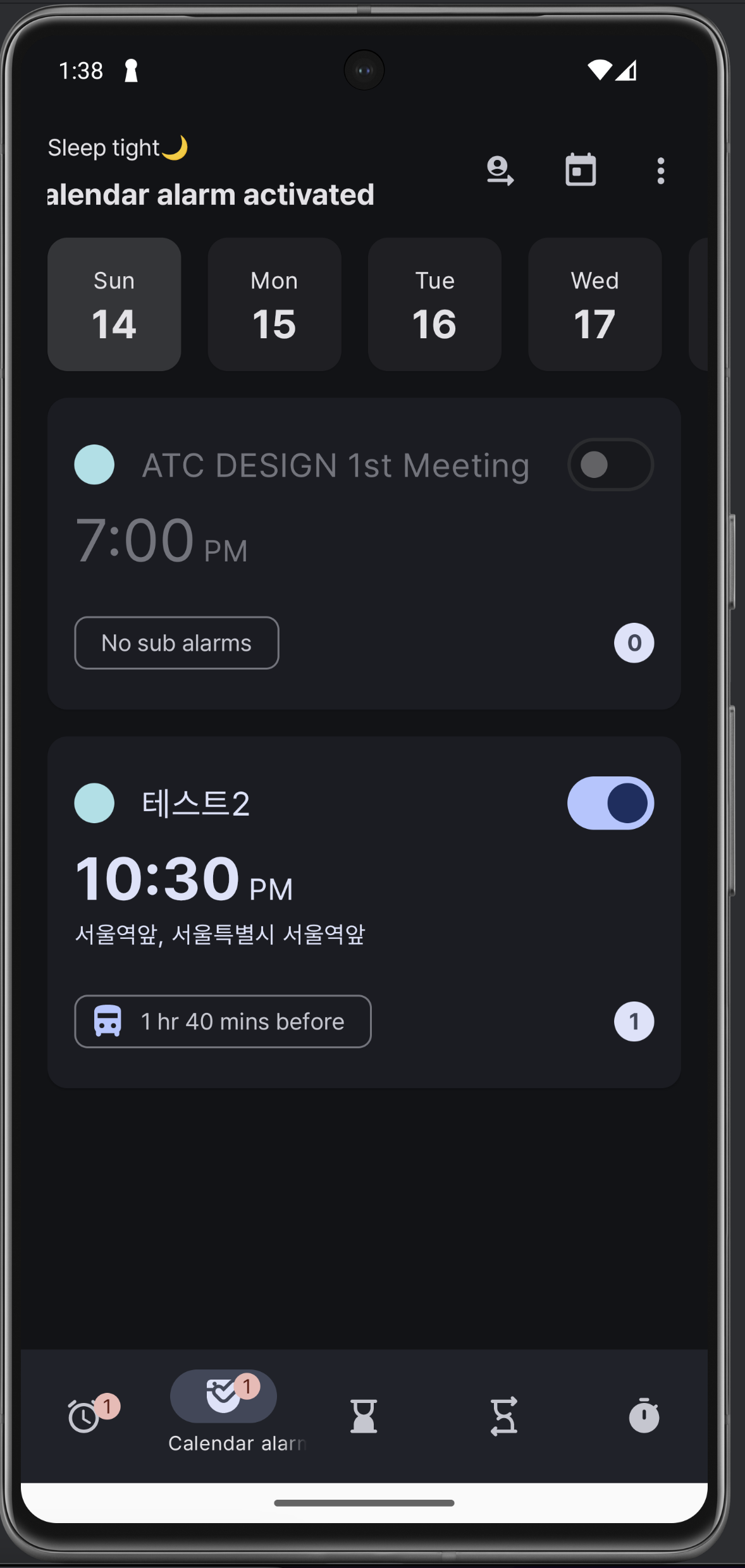 이건 어제 (12일) 변경한건데, "한 번만 사용"이 타이머에는 빨간 색으로 표시돼있는데 알람에는 그냥 다른 요일 반복처럼 보이는 게 좀 UI 통일성이 떨어져보여서 따로 뺐다. 스샷에는 찍지 못했는데 스누즈 처리한 것도 띄우게 해두었다. 그 외 폰트 굵기 정도 말고는 큰 차이가 없다. 등등..