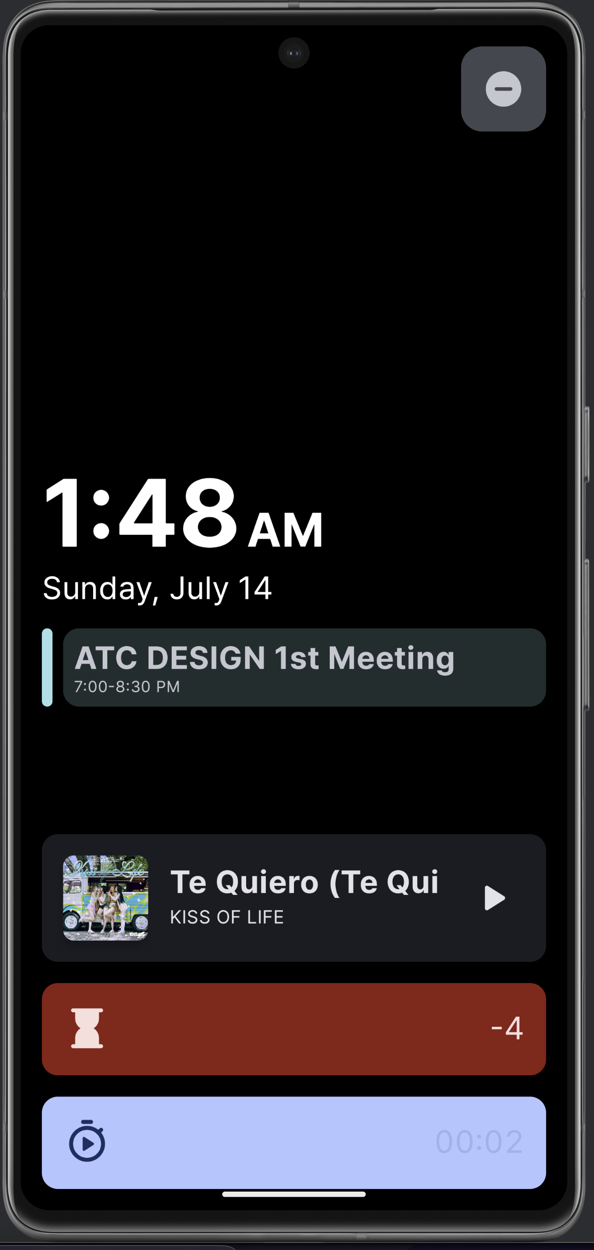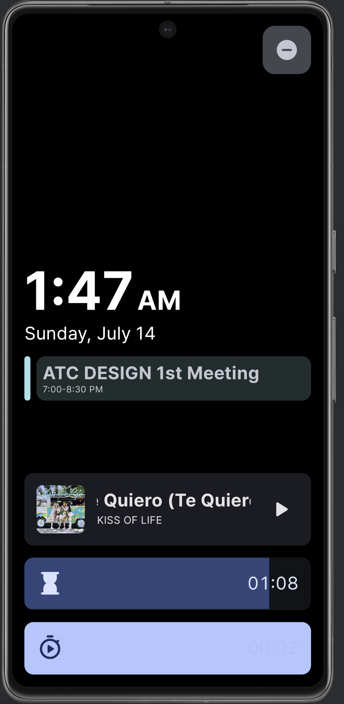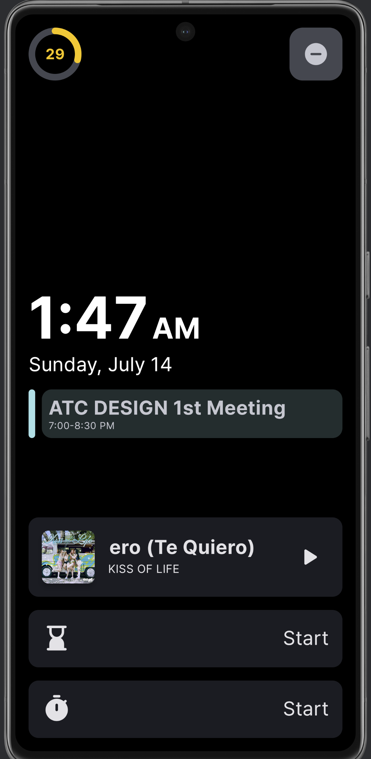 위에서 언급을 못했는데, 오늘 일정 중 가장 가깝거나 진행 중인 일정도 같이 보여준다. 이 디자인은 캘린더 알람 세부 화면 디자인을 그대로 가지고 왔음. 그리고 왼쪽 위 충전 아이콘은 Standby에 있는 애니메이션을 거의 그대로 들고 왔다. 근데 보면서 하다 보니 구현 자체는 쉽지 않았음 ...